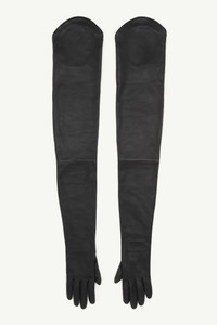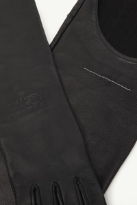 Extending beyond the elbow, these opera-length gloves blur the line between garment and accessory. Cut from supple glazed lambskin leather and lined in silk, they create a sculptural second skin that transforms styling into gesture. Part of the MM6 x Agnelle collaboration, they unite technical materials with contemporary styling. Product Details Item ID S62TS0079M07014900 Primary fabric: 100% Glazed lambskin, 100% Silk Opera-length gloves Extended silhouette reaching above the elbow Debossed numeric artwork White stitch line at the top