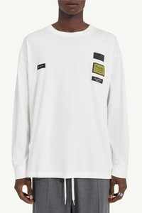 A cotton jersey long-sleeve T-shirt featuring jacquard labels embroidered across the chest. Traditionally placed on the interior, the labels are deliberately exposed, transforming functional markers into design features. At the rear, the Maison’s white stitch line completes the look. Product Details Item ID SH0NH0023M20170101 Primary fabric: 100% cotton Cotton jersey Patch applications on the chest Long sleeves Round neck White stitch line at the back Made in Italy