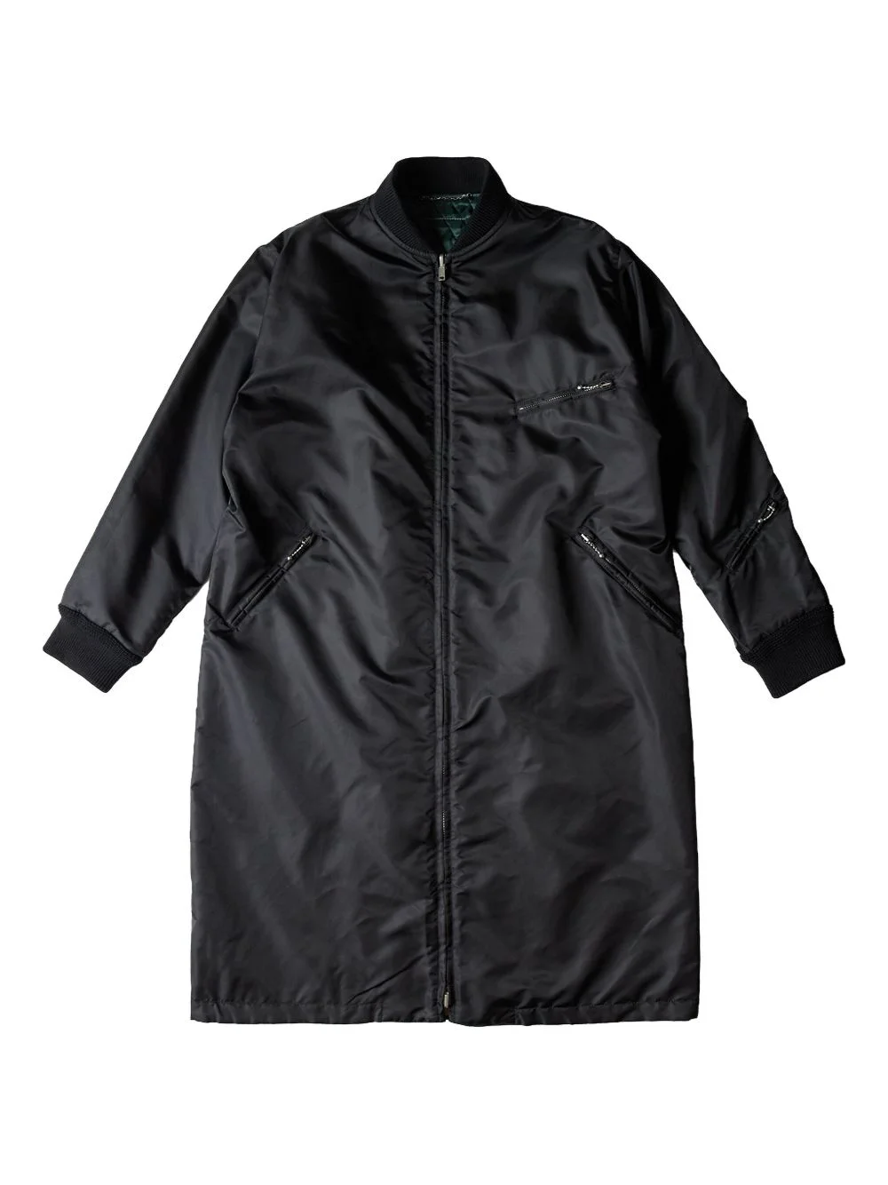 long zip-front bomber coat Highlights - Black - Longline - Zip fastening - Ribbed cuffs - Welt pockets - Quilted panelling Made in Italy Composition Polyester 100% Outer: Polyamide 100% Lining: Viscose 100% Washing instructions Read Manufacturer Guidelines