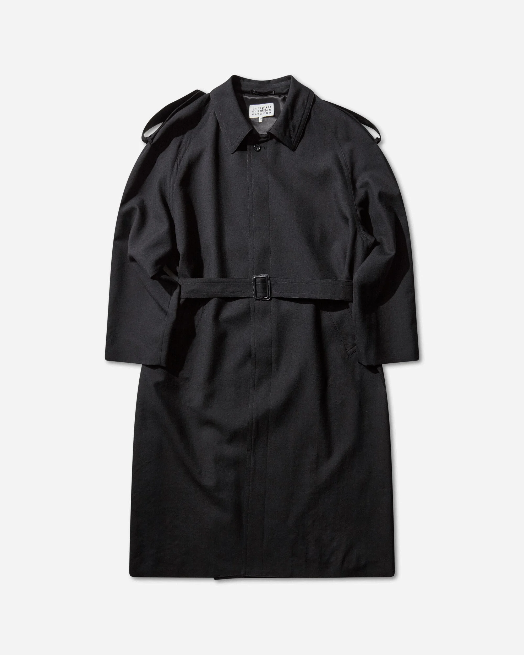 MM6 Maison Margiela Wool Trench Coat Black A reinterpretation of classic military codes, this trench coat is cut from pure wool with soft structure and an elongated drape. Functional detailing – including epaulettes, a storm flap and a tonal belt – contrasts with its minimal front. At the back, MM6’s horizontal white stitch line marks its discreet identity. - 100% Virgin Wool - Loose Fit - Pointed Collar - Epaulettes at Shoulders - Two Side Pockets - Removable Belt at Waist - Storm Flap and Rear Vent - Adjustable Cuffs - White Stitch Line at Back - Made in Italy - Style Code: SH2AH0013 900