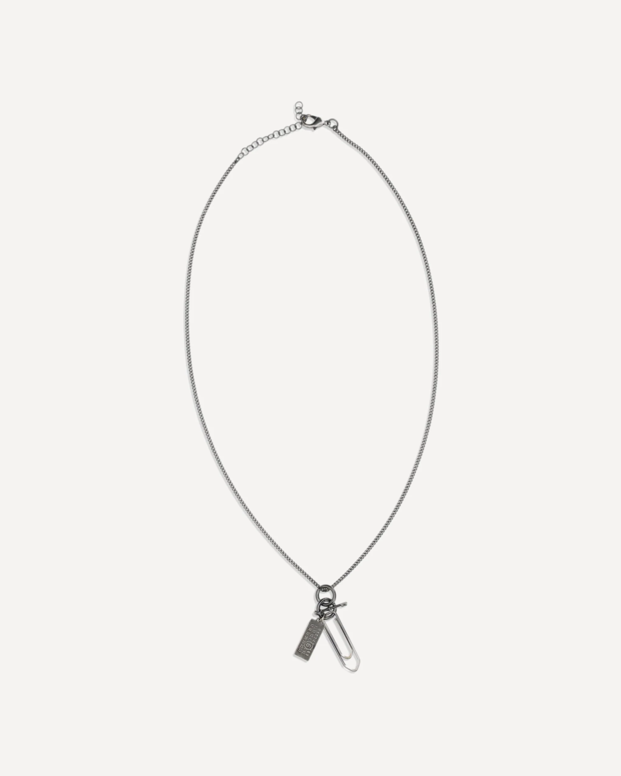 The metal paperclip Necklace by MM6 features a paperclip pendant detail and an engraved iconic logo plaque. The lobster clasp ensures practicality and security, completing an accessory with an original and contemporary design. DETAILS - Sku: SM6UU0093P8601_954 - Season: SS26 - Composition: GENERAL 100% Metal Metallic Metallised - MADE IN ITALY