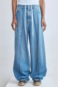The MM6 Blue Denim With Front Seam featuring a relaxed fit with a curved leg silhouette with frayed detailing, five-pocket styling, contrasting internal drawstring, back logo patch at the waist, and logo-engraved silvertone hardware. Model is 6ft and wears size 32 DETAILS - Wide-leg - Relaxed fit - Curved leg - Frayed detailing - Five-pocket styling - Internal drawstring - Logo patch at back - Logo-engraved silvertone hardware Sizing: - True to size Material: Cotton Made in Italy Product codes: - SKU: ESSX/MM6/AW25/SH0LA0011M30018967/Blue/28 - UPC: 8059039671158