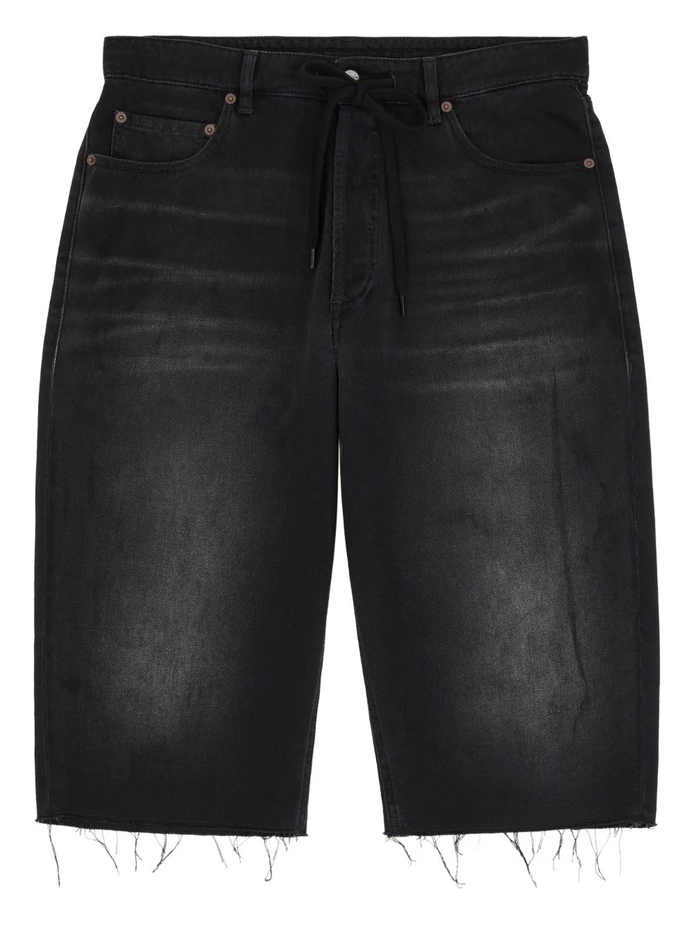 frayed denim shorts Highlights - Dark grey - Frayed hem - Drawstring fastening - Front welt pockets - Back patch pockets - Belt loops Imported Composition Cotton 100% Washing instructions Read Manufacturer Guidelines