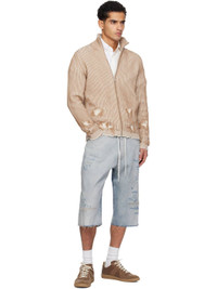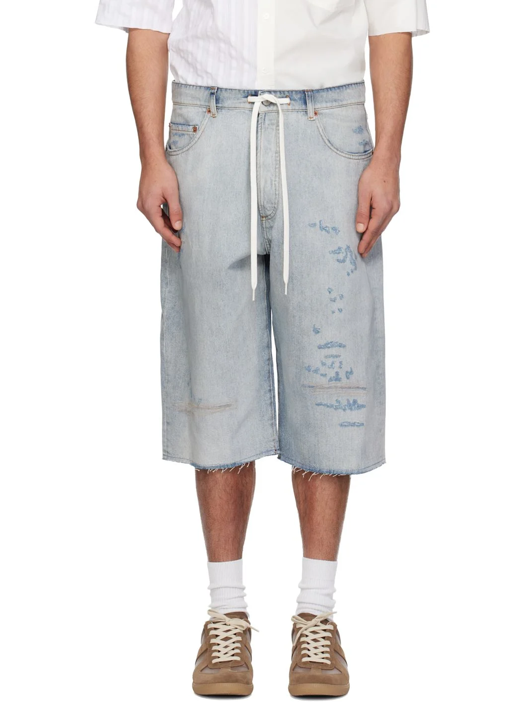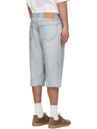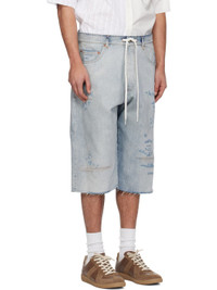 Non-stretch denim shorts. · Fading and distressing throughout · Drawstring at waistband · Belt loops · Five-pocket styling · Button fly · Raw edge at cuffs · Logo patch at back waistband · White stitching at back · Logo engraved silver- and copper-tone hardware · Contrast stitching in tan Supplier color: Light blue Body: 100% cotton. Trim: 65% polyester, 35% cotton. Made in Italy 261188M193010