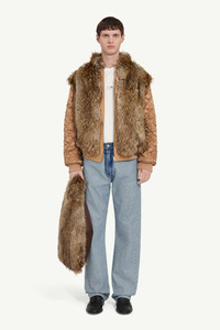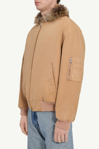 This MM6 bomber jacket explores layering through a hidden construction. A faux-fur vest sits beneath a clean outer shell, with a soft collar trim hinting at what's underneath. The tonal artwork and classic bomber details are left intact, grounding the surreal gesture in function. The MM6 signature white stitch is placed at the back: a discreet signifier of the Maison. Product Details Item ID SH0AM0054S78548156 Primary Fabric: 100% Cotton Secondary Fabric: 80% Acrylic 20% Polyester Pocket Lining: 100% Cotton Lining: 100% Viscose-Rayon Padding: 100% Polyester Bomber jacket in cotton twill with faux fur collar Reversible Embroidered numeric signature at the chest Utility pocket on the sleeve Welt pockets at the front Made in Italy Model is 190 cm tall and wears a size 48.