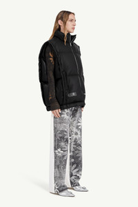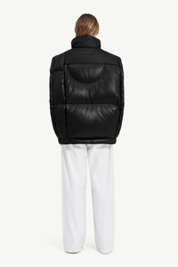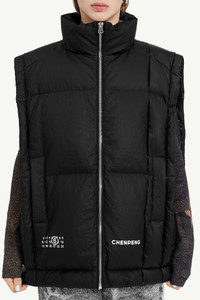 MM6 and CHENPENG present an outerwear collaboration for Autumn/Winter 2023 that illustrates their mutal value of sartorial wit. This duck down and PU leather sleeveless puffer jacket is finished with an MM6 numeric signature on the front, while on the other side a Chenpeng label. Zip closure and side pockets complete the design. MM6’s discreet yet distinct signature, a horizontal line of white stitches, is found on the back of the garment. Product Details Item ID S62FB0058S78460900 Composition: 100% viscose-rayon Coating: 100% polyurethane Lining: 100% polyester Padding: 90% duck down, 10% duck feather Puffer wasitcoat in faux leather Full-length zip closure Side pockets MM6 numeric signature and Chenpeng label at the front White stitch line at the back