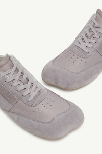 These slim-profile sneakers rely on subtlety: a muted white hue, MM6's signature anatomic toe, and the Maison's discreet numeric artwork on the side. Finished with a white stitch line at the back, they merge comfort, clarity, and a quietly assertive aesthetic. Product Details Item ID SH3WS0012P6435T8150 Upper: 100% calf leather Contrast: 100% calf leather Lining: 60% cotton, 40% polyester Inside: 100% calf leather Sole: 100% rubber Low-top sneaker silhouette Structured overlays with a mesh and synthetic layered upper Quick-pull toggle lace closure system Padded collar and tongue with pull tabs Reflective grey cage-like overlay Rounded toe shape Textured rubber outsole with lug tread pattern Black midsole with sculpted detailing Prominent branding on heel pull tab, side panel, tongue, and toe area White stitch line at the back Made in Italy