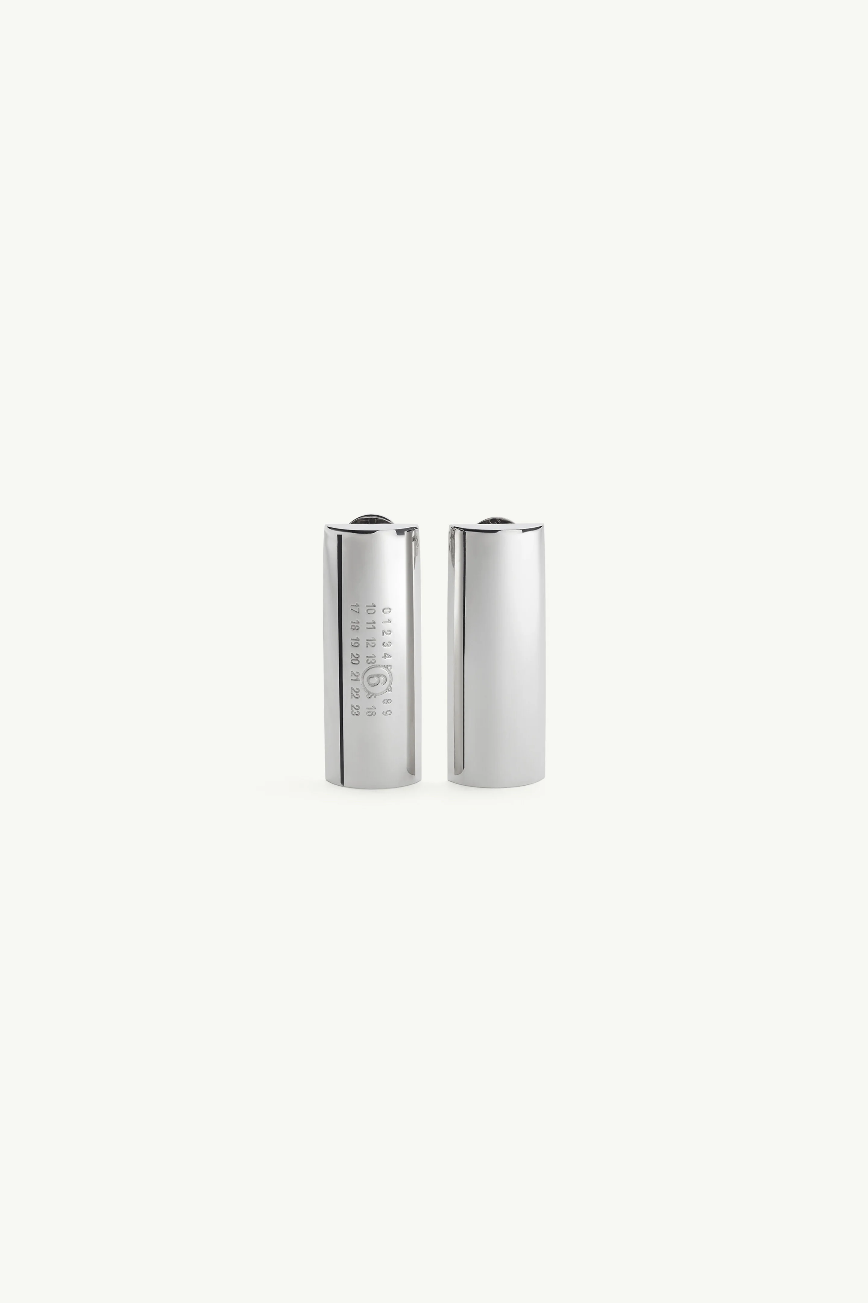 These drop earrings distort the idea of a pair. One bears the Maison’s numeric signature, the other remains intentionally blank – mirroring MM6’s tension between uniformity and interruption. The sculpted metal form is rounded at the edges for a softened, industrial finish. Product Details Item ID SM7VG0106P8754951 Primary material: 100% Silver-toned brass Secondary material: 100% Silver Rectangular earrings with a rounded contour Debossed numeric logo detail on one side Sold as a mismatched pair Butterfly fastening Made in Italy
