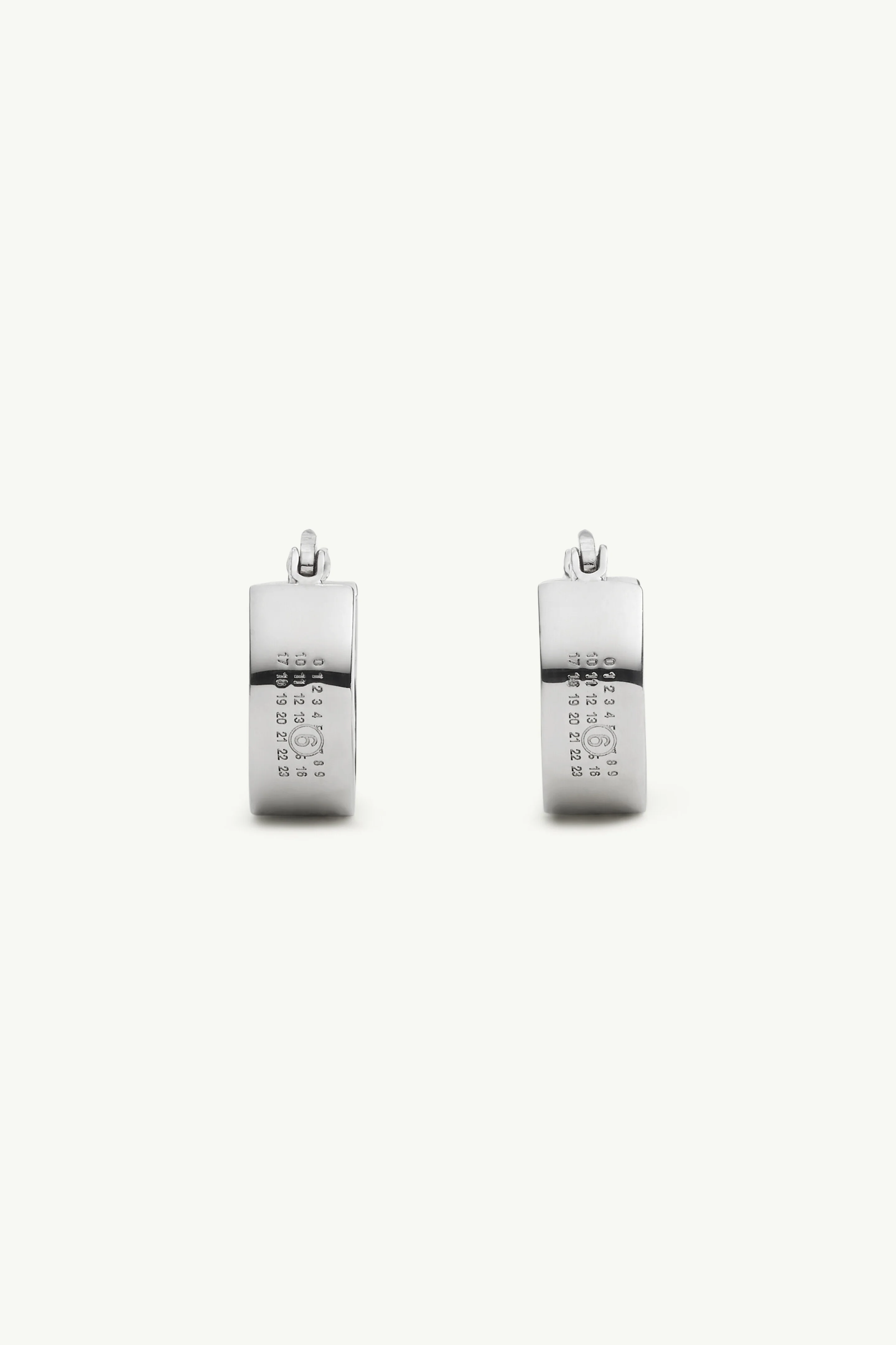 These hoops reinterpret everyday jewelry with MM6’s graphic identity. The polished surface is interrupted by the engraved numeric logo, shifting a minimal form into an emblem of subversive design. Product Details Item ID SM7VG0102SV0310951 Composition: 100% brass Contrast: 100% silver One size Brass hoop earrings Pair Engraved numerical logo detail Avoid salt, chlorine water and aggressive liquid Made in Italy