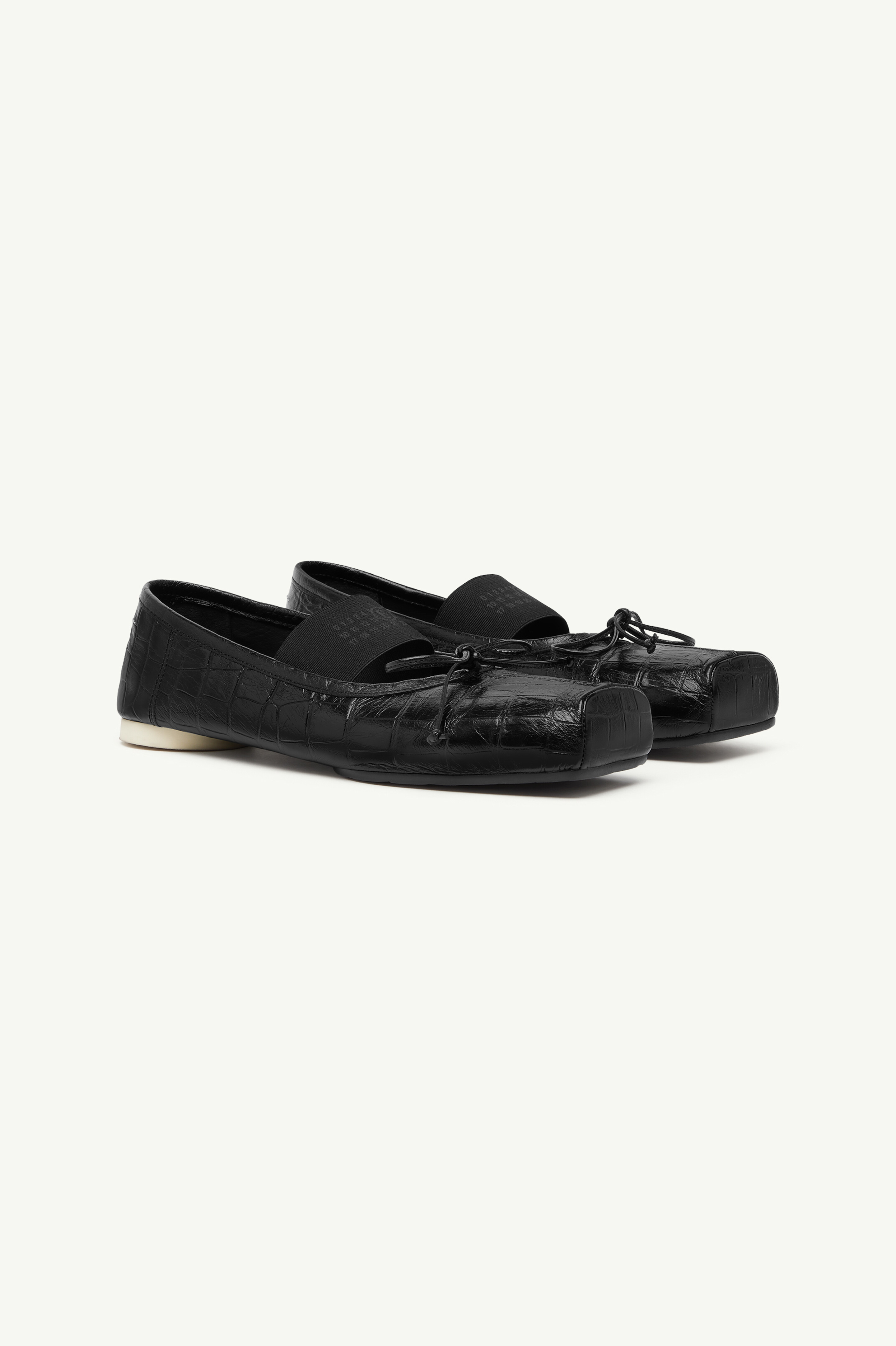 A square-toe ballerina with subversive detail. Crafted in croc-effect faux leather with dainty laces, this pair is finished with a wide elastic strap featuring the MM6 numeric signature. At the back, the Maison's white stitch line underscores their identity. Product Details Item ID S59WZ0103P7436T8013 Primary material: 100% Croc-print leather Secondary fabric: 60% Viscose, 40% Cotton Ballerinas in croc-effect faux leather Square toe Exposed central seam Elastic strap across the vamp printed with the MM6 numeric signature White stitch line at the back Made in Italy