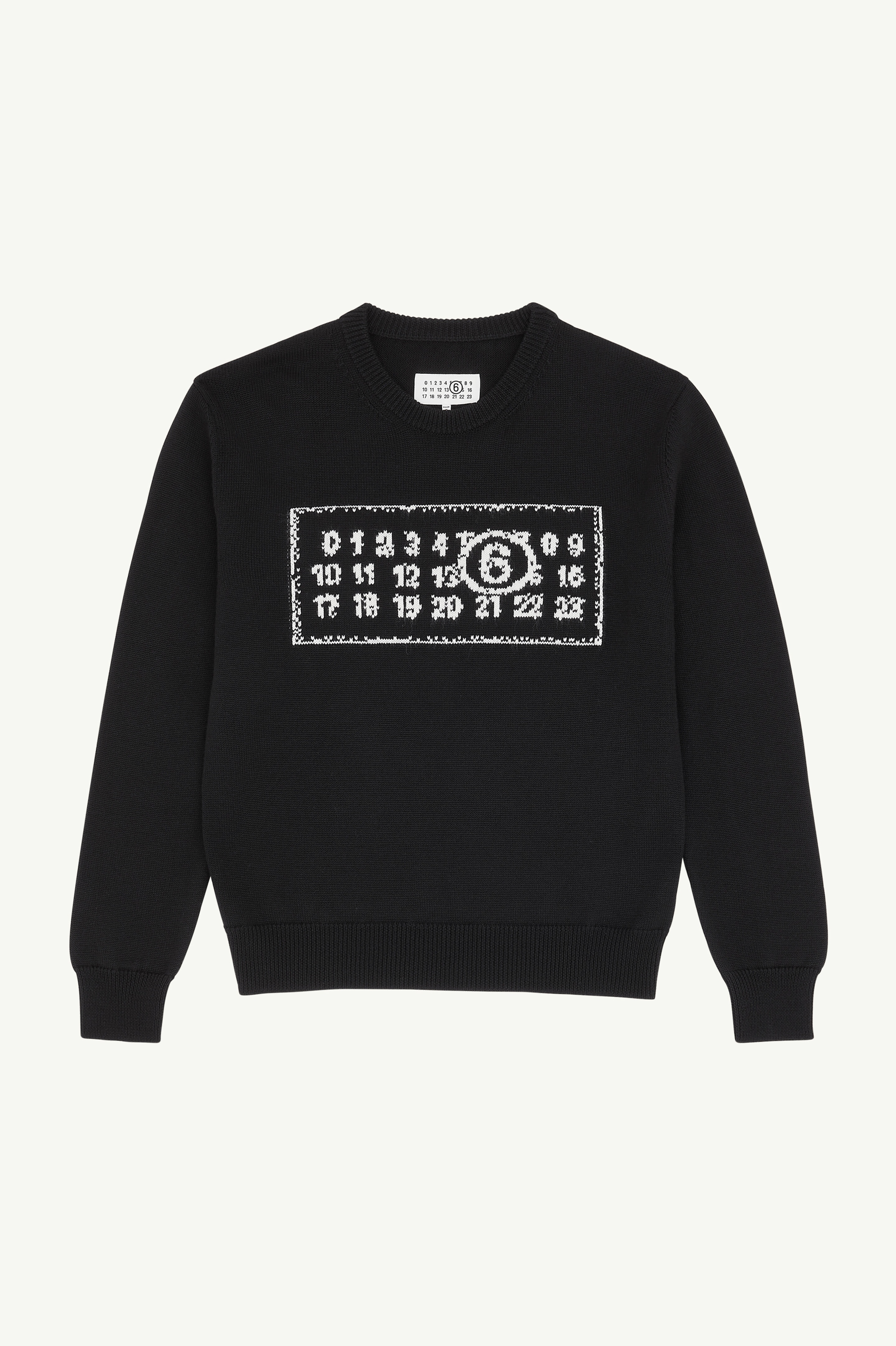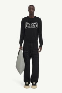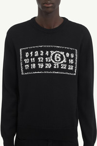 Numeric crewneck sweater knitted from gauge 7 wool to a subtly slouchy frame. The garment is detailed by the brand’s numeric jacquard signature at the front and by ribbed trims. MM6's discreet yet distinct signature, a horizontal line of white stitches, is also found on the back of the garment. Product Details Item ID SH0HL0016M13042900J Composition: 50% virgin wool, 50% acrylic Gauge 7 Wool jumper Crewneck MM6 numeric jacquard signature at the front Ribbed trims White stitch line at the back Model is 6'2" tall and wears a size M.
