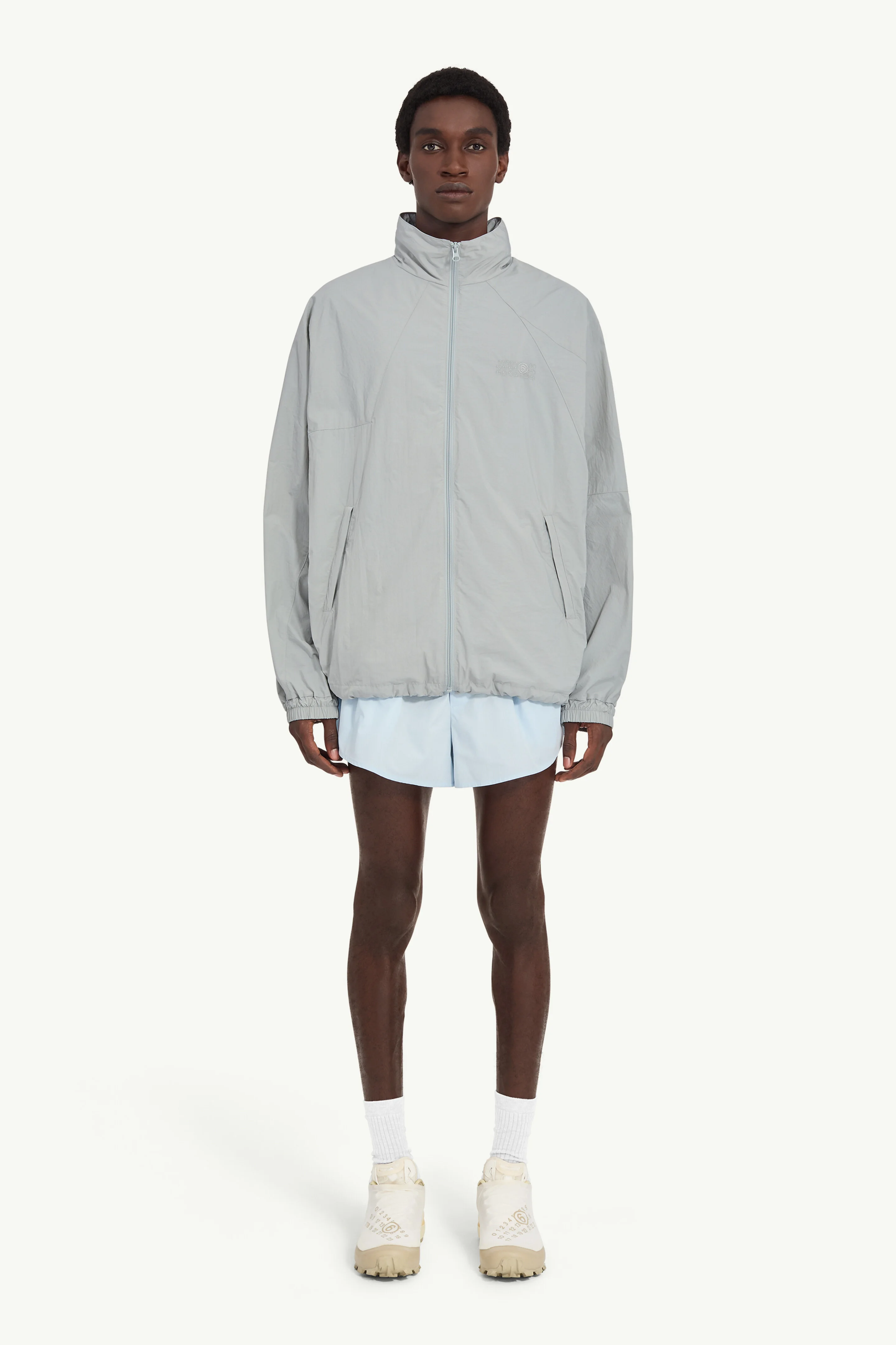 A nylon windbreaker with a high stand collar and relaxed proportions. The vented back yoke adds both ease and movement, while elasticated cuffs and hem refine the shape. Finished with the Maison’s numeric artwork embroidered at the chest and the MM6 stitch line at the back Product Details Item ID SH0AM0083M35732850 Primary fabric: 100% polyamide-nylon Lining: 100% polyester Crispy thin nylon Long sleeves High neck Center zipper closure White stitch line at the back Made in Italy