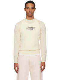 Knit virgin wool sweater. · Distressing throughout · Rib-knit crewneck, hem, and cuffs · Logo embroidered at chest · White stitching at back Supplier color: Off white Body: 100% virgin wool. Trim: 100% calfskin. Made in Romania 252188M201001