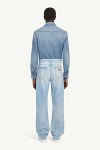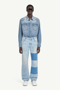 These 5-pocket jeans disrupt convention with two contrasting patches on one leg, playing with proportions and texture. Inspired by found garments, they reflect MM6’s eclectic approach to everyday staples. The numeric artwork tag and white stitch line at the back add subtle signatures to this recontextualised classic. Product Details Item ID SH2LA0025M30018966 Primary Fabric: 100% Cotton Blue denim trousers Contrasting details Regular waist Button closure Straight leg White stitch line at the back Made in Italy