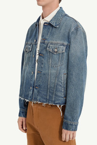 This blue denim jacket embodies MM6’s deconstructive design ethos with its raw-edge hem and deliberately undone details. The design features buttoned flap pockets and cuffs for a utilitarian touch, while the white stitch line at the back underscores the Maison’s distinctive identity. Product Details Item ID SH0AM0026M30018965 Primary fabric: 100% cotton Pocket lining: 65% polyester, 35% cotton Blue denim jacket Button closure Buttoned flap pockets Buttoned cuffs Raw-edge hem White stitch line at the back Made in Italy