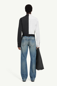 Crafted in faded mid-wash denim, these straight-leg jeans are reworked with a waistband replaced from another garment. The splice technique underscores MM6's deconstructive ethos, transforming a familiar cut into a statement. Finished with a tan numeric artwork patch and the Maison’s white stitch line at the back. Product Details Item ID SH0LA0032M30055961 Primary fabric: 100% cotton Pocket lining: 65% polyester 35% cotton Full-length straight-leg jeans Zip and button front closure White stitch line at the back Made in Italy
