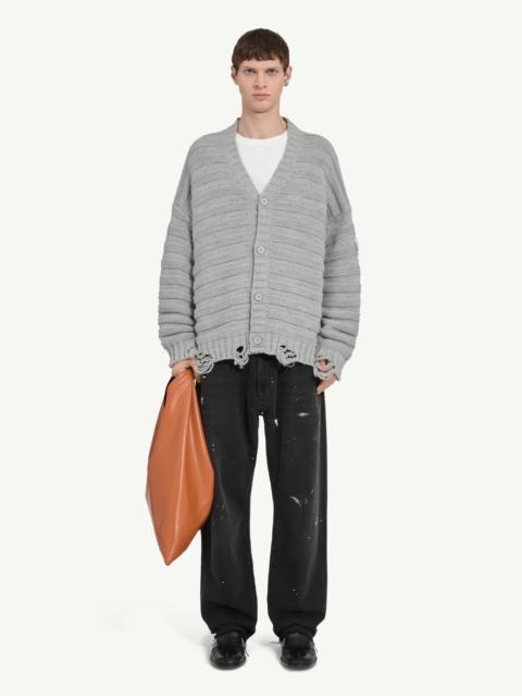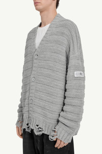 Numeric crewneck cardigan knitted from wool to a subtly slouchy frame. The garment is detailed by the brand’s numeric jacquard signature at the front and by ribbed trims. MM6's discreet yet distinct signature, a horizontal line of white stitches, is also found on the back of the garment. Gauge 7. Product Details Item ID SH0HP0005M13040857M Primary fabric: 50% Virgin Wool, 50% Acrylic V-neckline, button-front, ribbed knit Oversized silhouette, boxy cut Long sleeves, dropped shoulders Five-button front closure Horizontal ribbed knit texture Distressed, frayed hem and cuffs Patch logo label on left sleeve Straight hemline for clean finish White stitch line at the back Model is 190 cm tall and wears a size M.