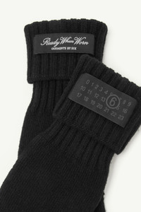 Knit gloves in a soft wool blend with a ribbed cuff that folds neatly at the wrist. The exposed MM6 artwork label, usually concealed inside garments, is placed at the turn-up, shifting a practical layer into a statement of construction. Product Details Item ID S52TS0048M13217900 Primary fabric: 79% wool 19% polyamide-nylon 2% elastane-spandex Gauge 7 Ribbed knit design Logo label on the cuff White stitch line at the back Made in Italy