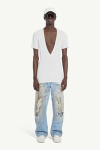 A deep V-neck crafted with MM6’s minimalist precision. Woven in ribbed material for a form-fitting silhouette, it balances bold proportions with subtle restraint. The Maison’s numeric artwork at the back delivers a quiet signature to this sleek, modern essential. Product Details Item ID SH2HN0003M13125102 Primary Fabric: 64% Viscose-Rayon 36% Polyamide-Nylon Gauge 14 Ribbed jumper Deep V neck Short sleeves White stitch line at the back Made in Italy
