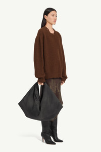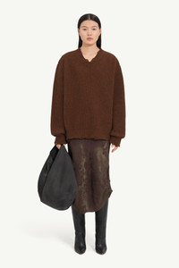 This V-neck jumper features distressed edges and irregular fraying that break the uniformity of its soft, sculptural form. The relaxed silhouette invites everyday wear, while the white stitch line at the back serves as a discreet yet deliberate MM6 signature. Product Details Item ID SH0HN0003M13138142M Primary fabric: 80% Wool, 20% Polyamide-Nylon Boxy knit with raw edges and visible seams V-neckline with distressed edges Long raglan sleeves, distressed cuffs Ribbed texture throughout Distressed holes near hem and sleeves Visible seam lines on sides and shoulders Raw hemline, distressed finish White stitch line at the back Made in Italy Model 1 is 179 cm tall, model 2 is 190 cm tall and wears a size M.