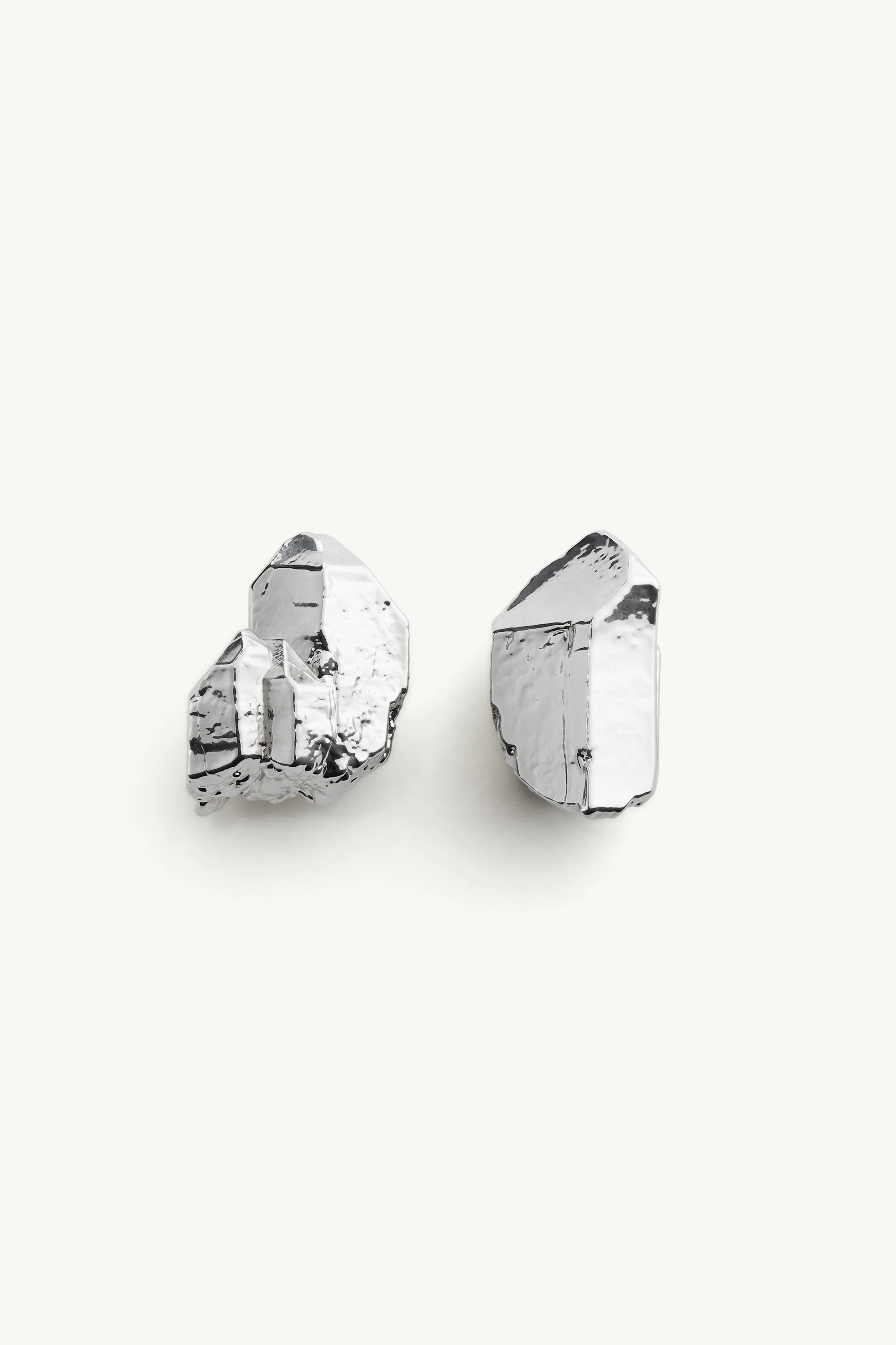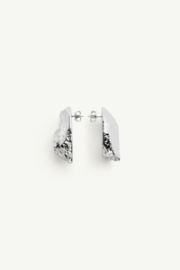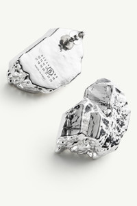 These assymetrical earrings reshape the hoop into something more elemental. Their surface appears carved by time and pressure, balancing sharp lines with softened edges. A signature MM6 contradiction. Product Details Item ID SM7VG0107P8604951 Primary material: 100% Copper Secondary material: 100% Silver Sculptural hoop earring with high-shine finish Organic silhouette with textured ridges Made in Italy