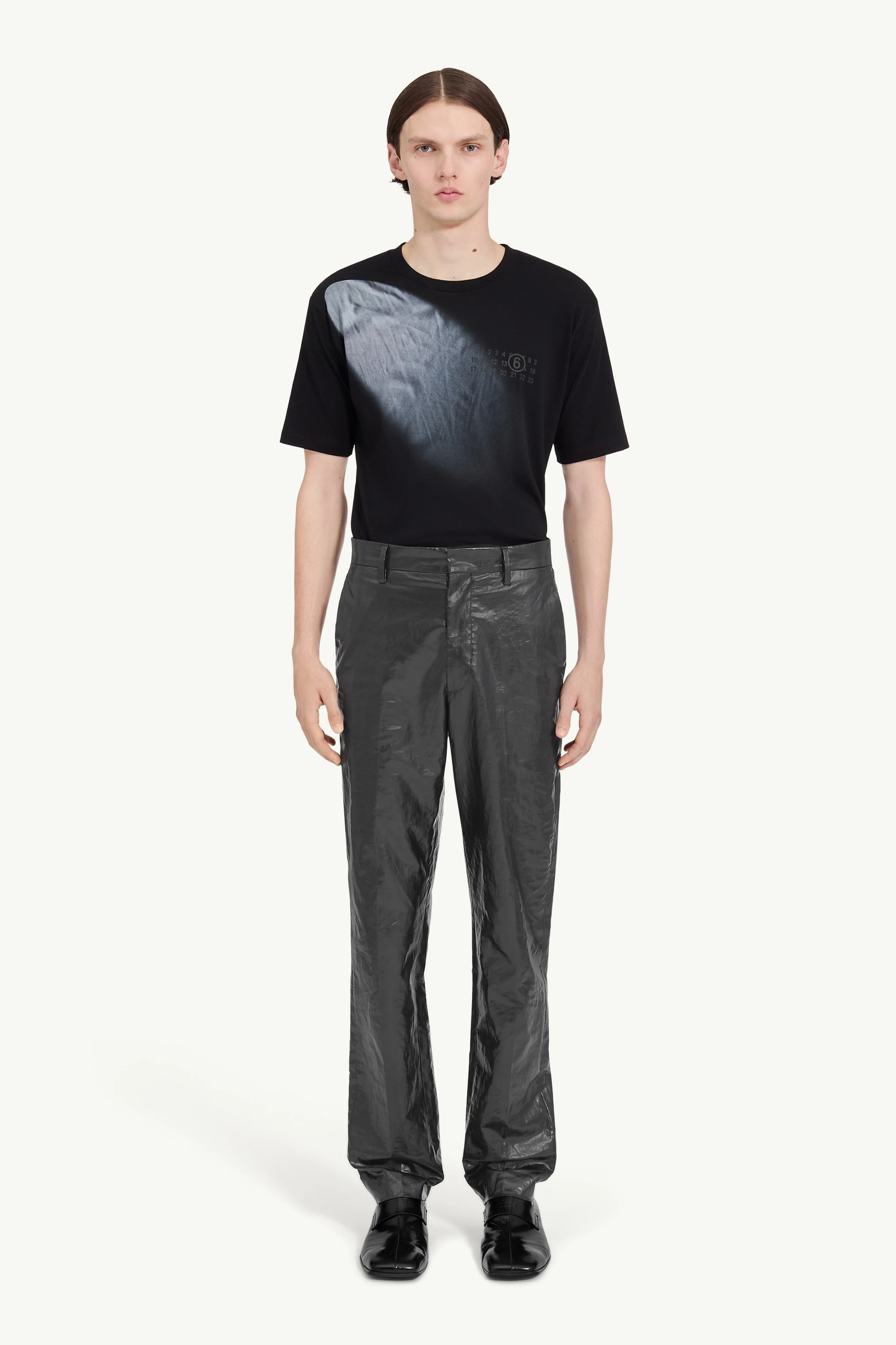 Cut from coated linen, these MM6 trousers offer a high-shine finish with a softly creased texture. Tailored with belt loops and a rear welt pocket, the silhouette channels classic menswear – elevated with an unconventional surface treatment. Finished with the MM6 white stitch line at the back. Product Details Item ID SH2KA0051M35617900 Primary Fabric: 100% Linen Secondary Fabric: 100% Polyurethane Straight-leg coated trousers High-shine, crinkled finish Belt loops Back welt pocket White stitch line at the back Made in Italy Model is 186 cm tall and wears a size 48.