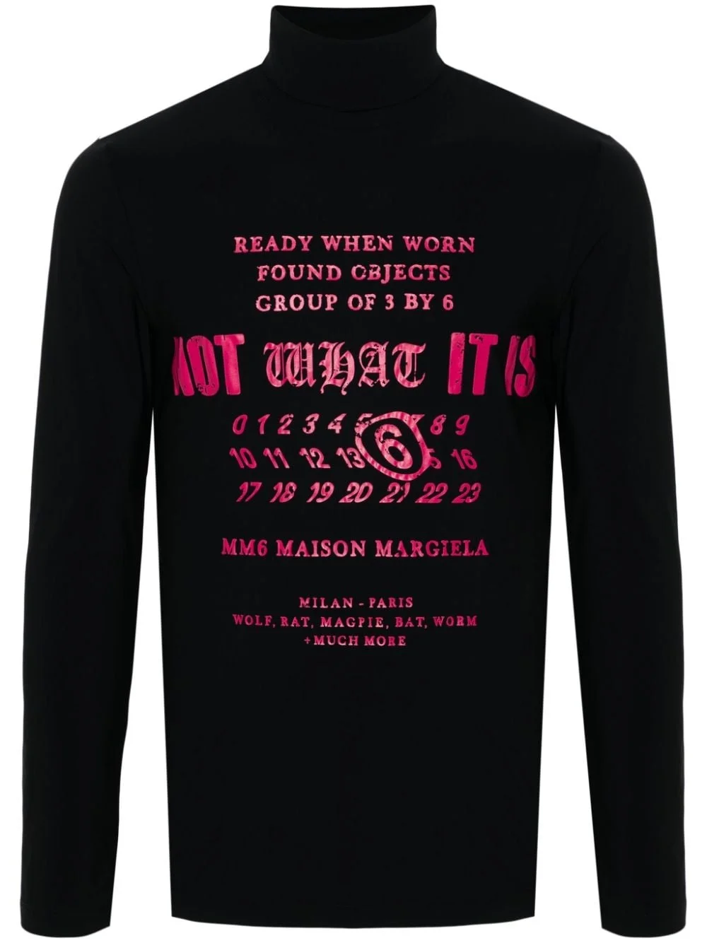signature numbers print top Highlights - Black/dark pink - Stretch-design - Roll neck - Signature numbers print - Slogan print to the front - Logo print to the front - Long sleeves - Straight hem Made in Italy Composition Polyamide 75%, Elastane 25% SIZE & FIT Model measurements Height 6 ft 2 in(1.87 m) Bust/Chest 38.18 in(97 cm) Hips 36.61 in(93 cm) Waist 29.13 in(74 cm) FittingInformation Designed for a slim fit, offering a comfortable fit that sits just away from the body Made from a midweight stretch fabric, this piece offers elasticity and flexibility when worn