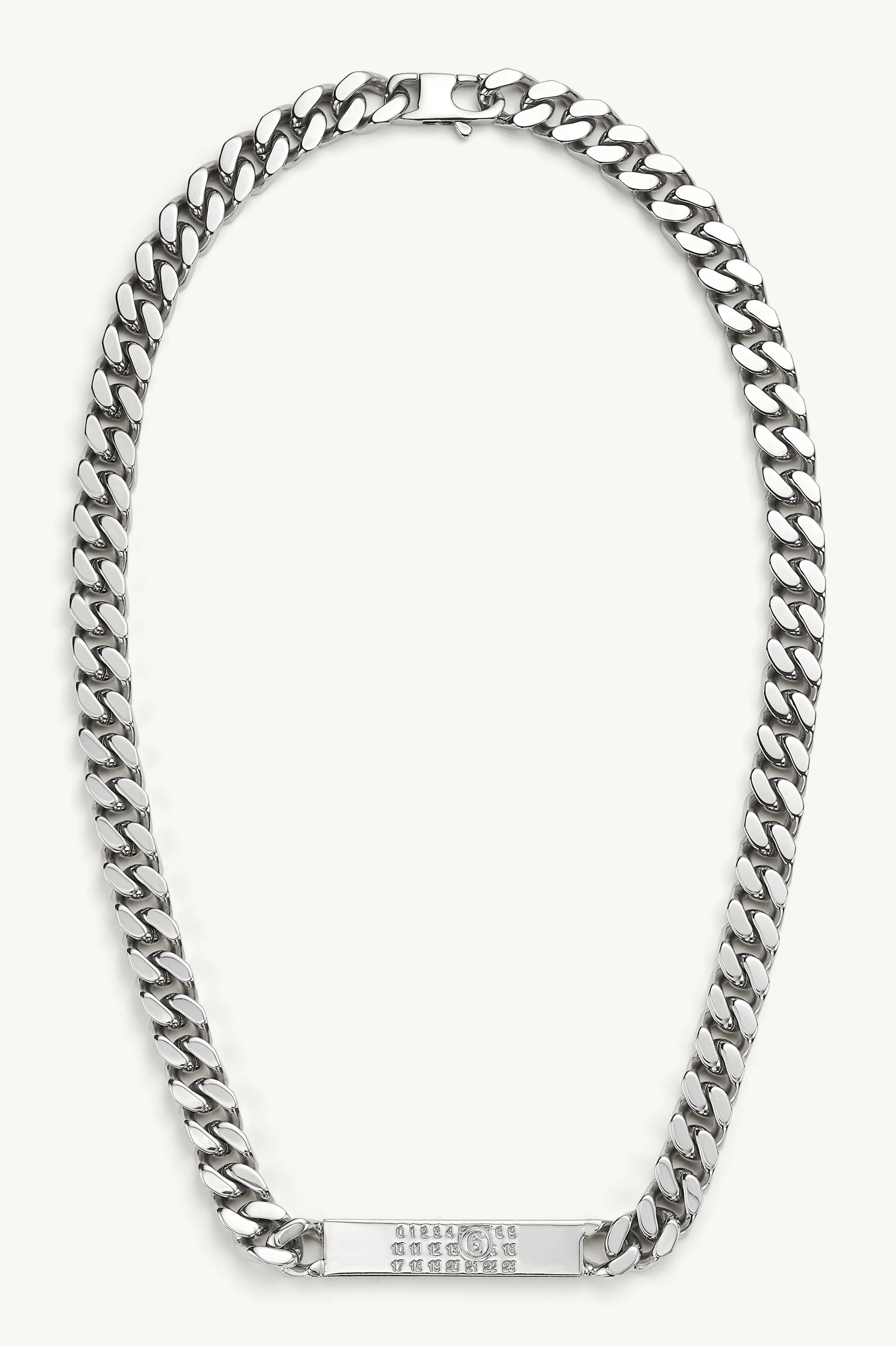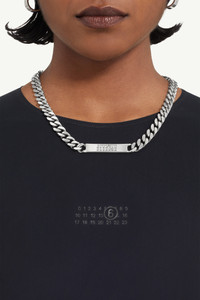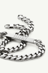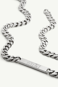 Chain necklace in brass, inspired by classic Margiela chain jewellery designs. Displays an engraved numerical signature on a plate. Product Details Item ID SM6UU0033SV0235951 Composition: 100% brass Polished Palladio Classic chain necklace One size Engraved MM6 numeric signature on the tag Made in Italy The item comes in a white zipped bag