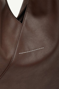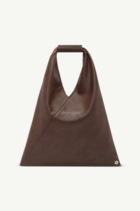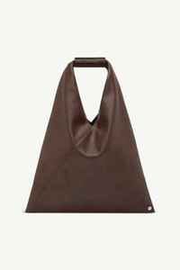 First introduced in the Autumn-Winter 2009 collection, the Japanese bag has become MM6’s most iconic accessory. Its triangular folds take inspiration from origami, reworking a simple tote into a sculptural form. Press-stud buttons at the corners allow the bag to shift shape, a quiet gesture of the Maison’s deconstructionist ethos. At the back, the horizontal white stitch line affirms the MM6 signature. Product Details Item ID S54WD0043P8396T2164 Body: 100% polyurethane Contrast: 100% calf leather Lining: 100% cotton Metallic parts: 100% copper Top handles Embossed logo on the handle Snap button closure White stitch line at the back
