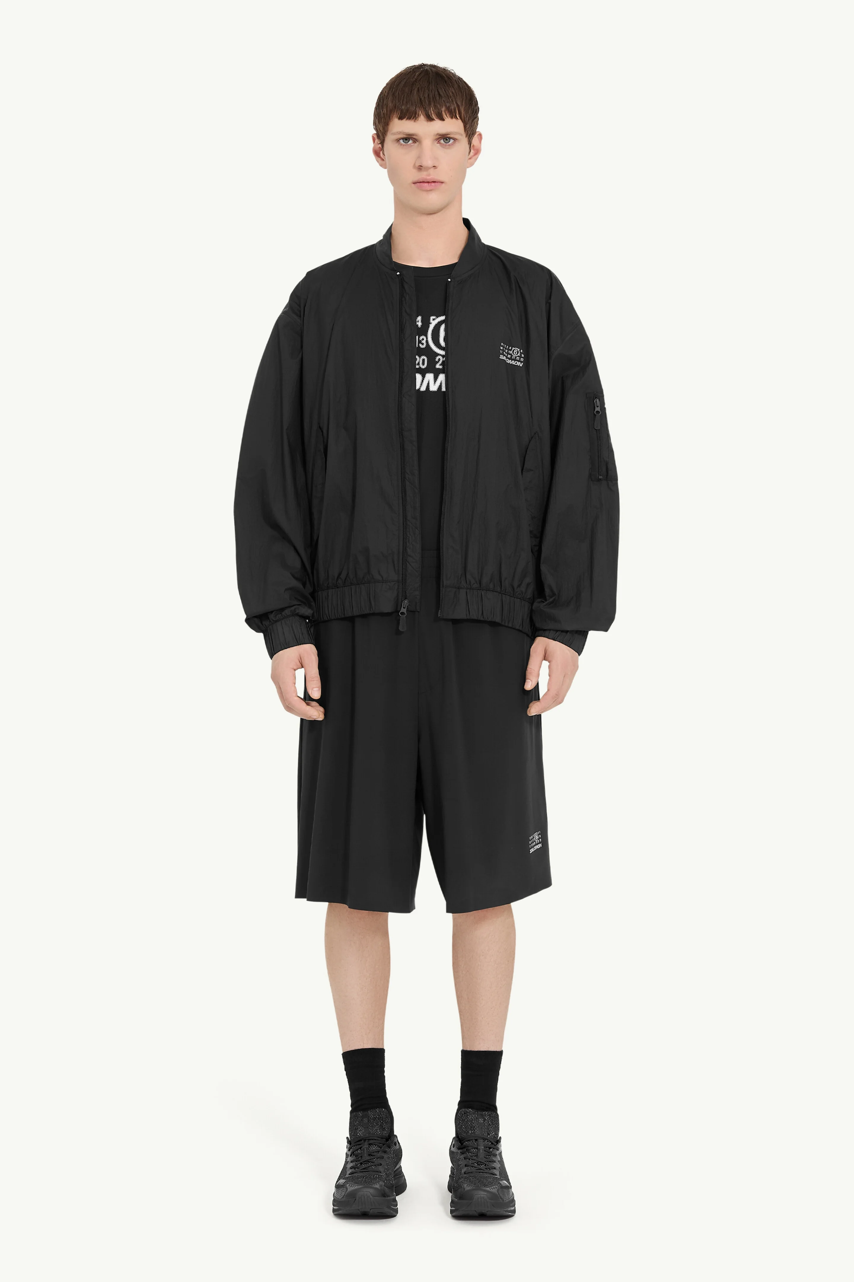 This nylon sports jacket merges MM6’s distinctive design with Salomon’s performance-driven craftsmanship. Zip and button pockets add practical functionality, together with an elasticated waist and cuffs for a snug fit. Finished with the Maison's signature white stitch line at the back, it offers a modern perspective on functional outerwear. Product Details Item ID SH0AM0056M35418900 Primary fabric: 100% nylon Nylon sport jacket Zip closure MM6 x Salomon label at the front Buttoned side pockets Utility zip pocket on right arm Elasticated waist and cuffs MM6 x Salomon label at the back