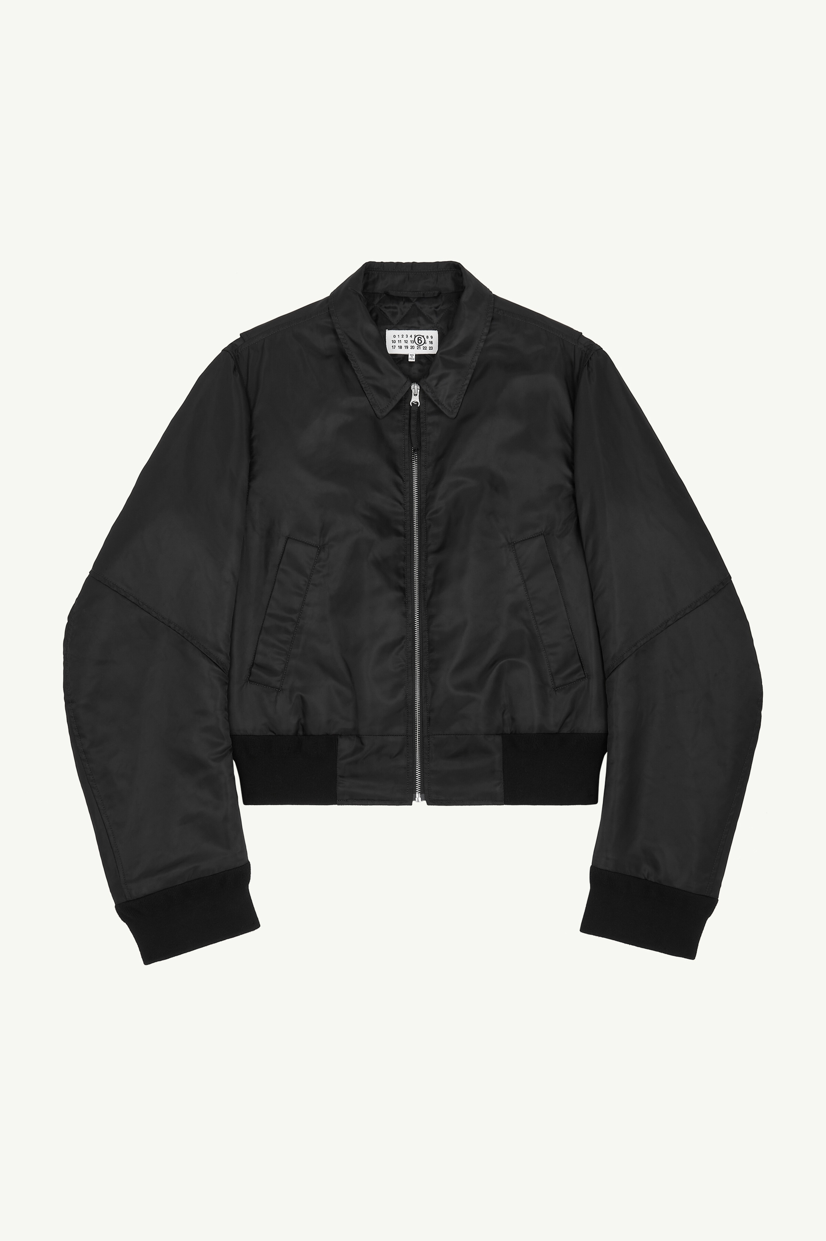 MM6’s cropped sports jacket features zip closure, side pockets and elasticated waist and cuffs. The brand’s discreet yet distinct signature, a horizontal line of white stitches is found on the back of the garment. Product Details Item ID SH2AM0006S53984900 Model is 188 cm tall and wears a size 48.