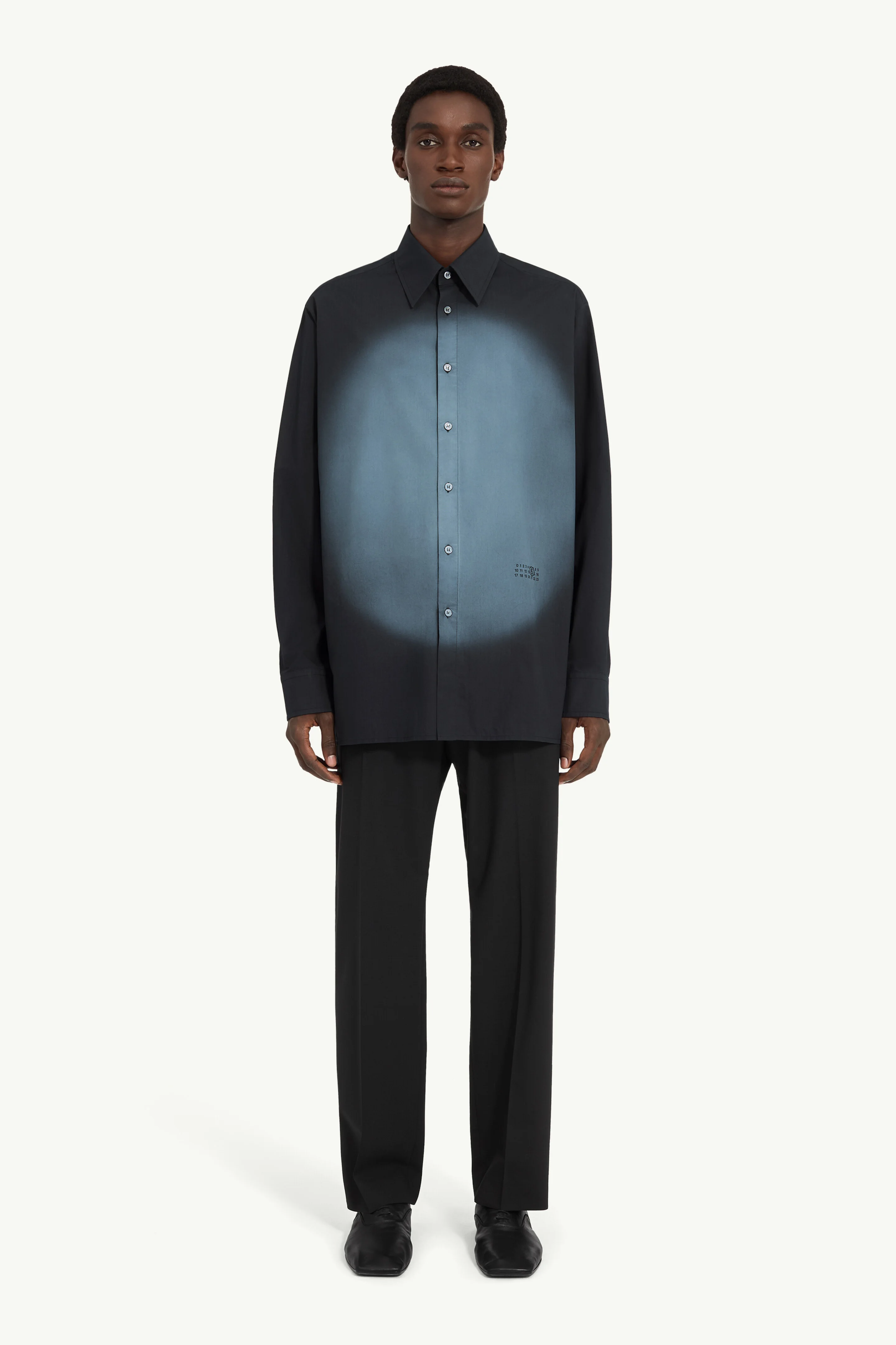 In crisp cotton, this shirt is defined by a striking spray-print gradient across the front. The effect transforms a simple silhouette into a statement piece, with the MM6 numeric artwork reinforcing its graphic edge. At the back, the Maison’s white stitch line signals its signature. Product Details Item ID SH0DT0042M35256899 Primary fabric: 100% cotton Degrade spray front treatment Long sleeves Shirt collar Flat buttons closure at the front White stitch line at the back Made in Italy
