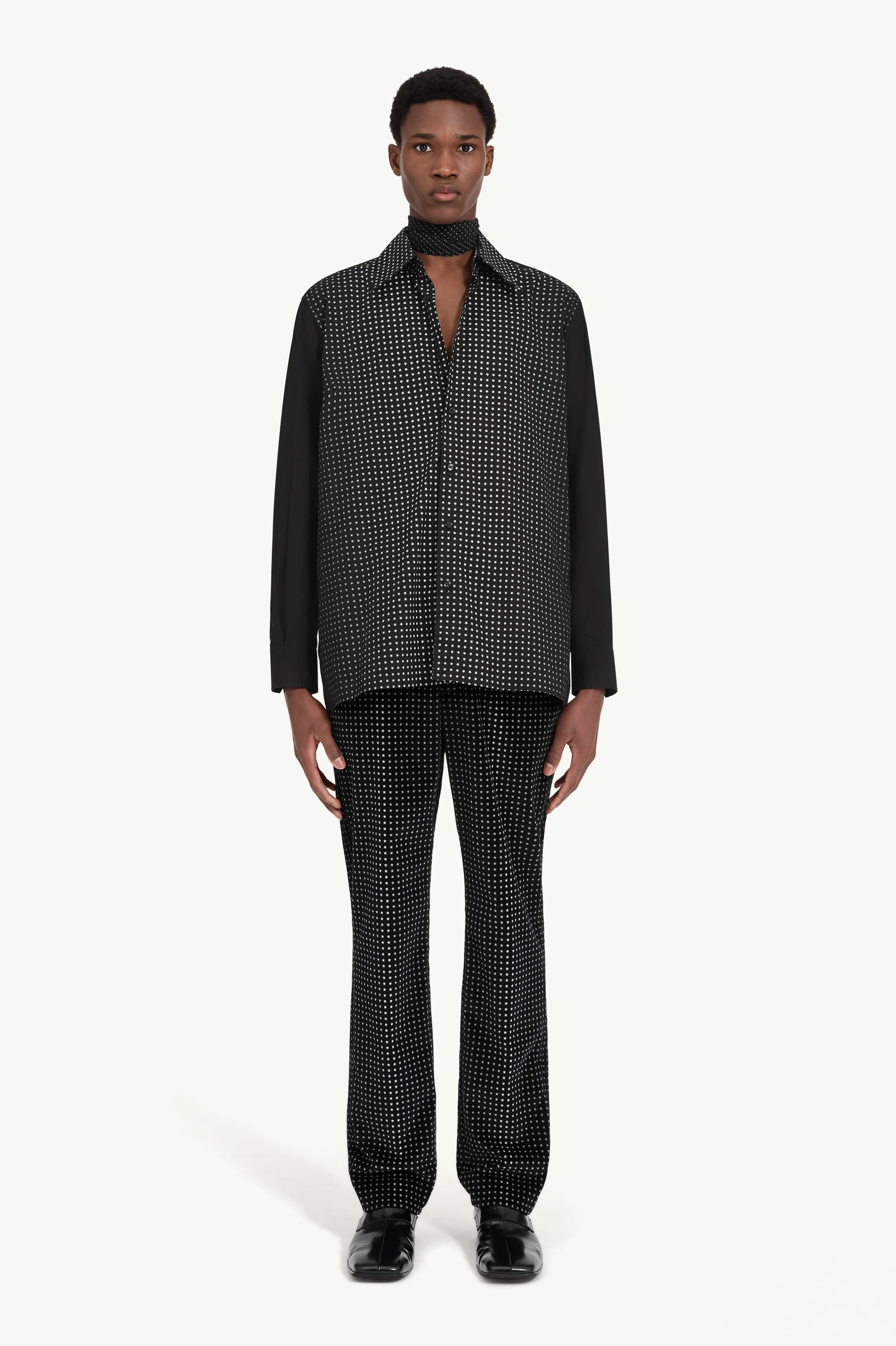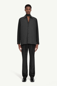 Defined by a textural flat print technique, this shirt is patterned with a monochrome star motif inspired by archival designs and Miles Davis’ wardrobe. Each piece is uniquely finished, with solid black sleeves framing the print in sharp contrast. Product Details Item ID SH2DT0032M35634001S Primary fabric: 100% Cotton Star-printed shirt Block-colour sleeves Point collar Button front closure Flat garment print technique Made in Italy Model is 190 cm tall and wears a size 48.