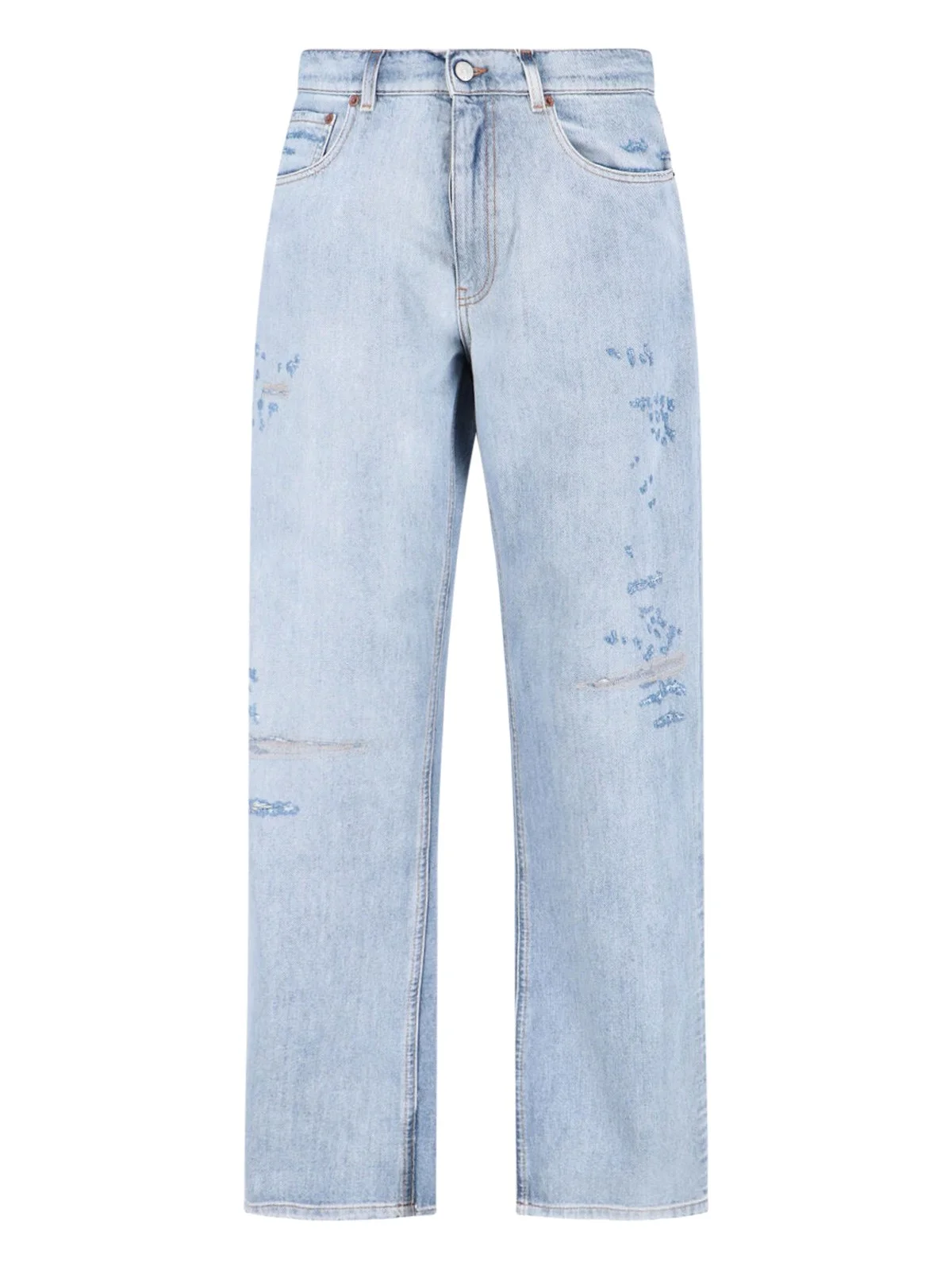 MM6 MAISON MARGIELA STRAIGHT JEANS IN LIGHT BLUE COTTON DENIM WITH DISTRESSED WASH, DESTROYED EFFECT, MID WAIST, BELT LOOPS, FIVE-POCKET DESIGN, BUTTON AND ZIP CLOSURE, LEATHER LOGO PATCH AT THE BACK, ICONIC STITCHING AT THE BACK, STRAIGHT LEG. PRODUCT INFO PRODUCT CODE SH0LA0033 M30055962 COMPOSITION: 100% COTTON SIZE AND FIT: REGULAR FIT MADE IN: ITALY
