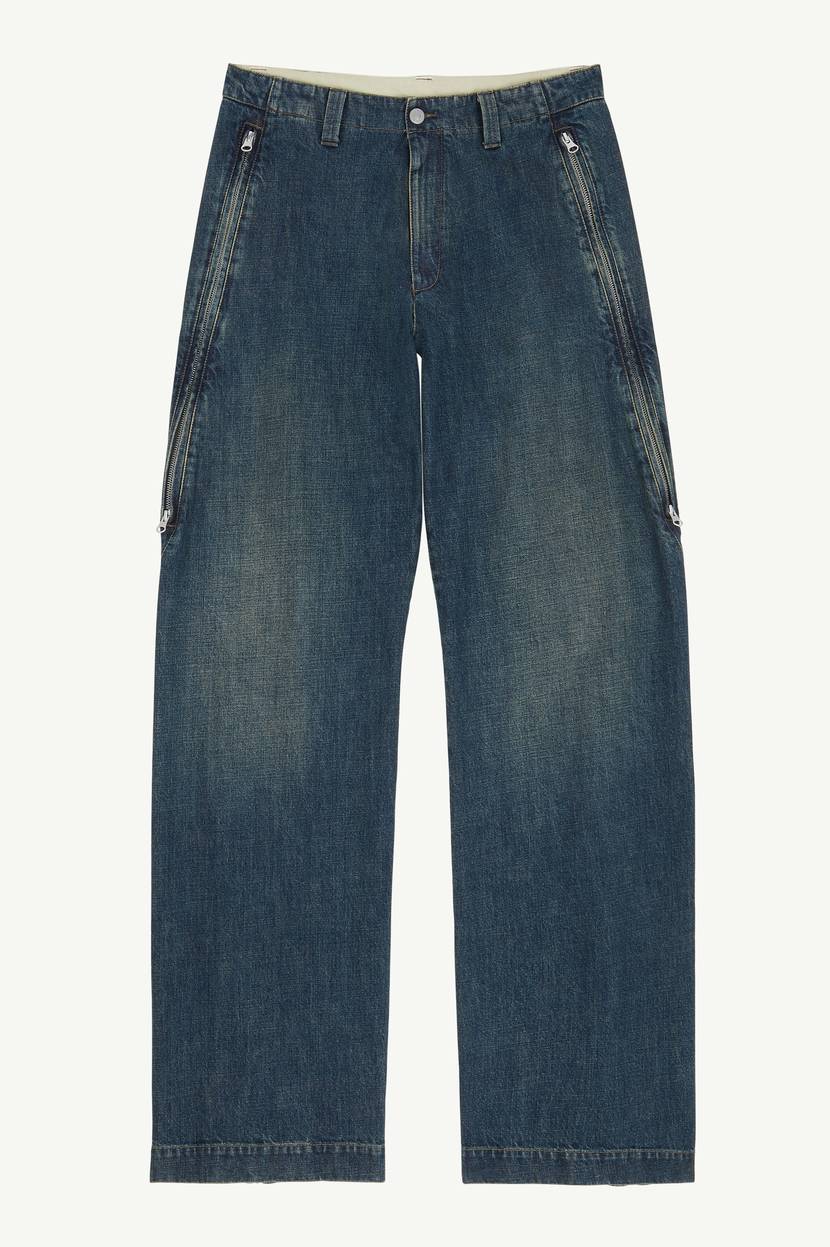 MM6’s five pocket trousers are shaped to a straight-leg and made from cotton-blend denim that’s stonewashed for a lived-in feel. The trousers are accented with tonal top stitching and feature zip pockets, button closure, belt loops and a zip hem. The brand’s discreet yet distinct signature, a horizontal line of white stitches, is also found on the back of the garment. Product Details Item ID SH0KA0011S30888961 Composition: 100% cotton Pocket lining: 65% polyester, 35% cotton Blue denim 5 pocket trousers Straight leg Zip pockets Button closure Belt loops Zip hem White stitch line at the back Made in Italy Model is 188 cm tall and wears a size 48.