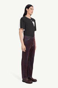 Rendered in a vivid tone with a tactile, timeworn finish, these MM6 jeans walk the line between grunge and refinement. The coated surface appears aged and textured, dyed in a rich hue with tonal variations that hint at movement and depth. Finished with the MM6 white stitch line – a subtle mark of subversion. Product Details Item ID SH2LA0037M30039227 Primary fabric: 98% Cotton, 2% Elastane Secondary fabric: 100% Viscose Straight-leg jeans in coated stretch denim Five-pocket construction Belt loops Back leather logo patch White stitch line at the back Made in Italy Model is 188 cm tall and wears a size 32.