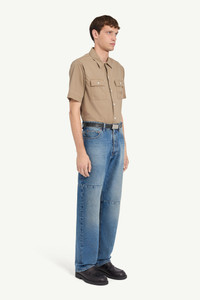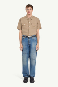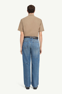 Straight-leg jeans in classic blue denim with a subtle faded finish. Reinforced seam panels at the knees lend a workwear edge, while tonal stitching enhances the utilitarian mood. Complete with a black leather logo patch and the signature white stitch line at the back. Product Details Item ID SH0LA0009M30058965 Primary fabric: 100% cotton Pocket lining: 65% polyester 35% cotton Full-length straight-leg Five-pocket design with knee panel detail Button and zipper closure at the front White stitch line at the back