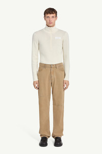 Treated for a grainy, sand-washed effect, these denim jeans convey a raw, tactile character. The straight-leg cut is enhanced by utilitarian knee panels and classic rivet detailing. A tonal leather patch bearing the Maison’s numeric artwork sits at the back, finished with its signature single white stitch. Product Details Item ID SH0LA0009M30050123 Primary fabric: 100% cotton Coating: 100% polyurethane Pocket lining: 100% cotton Full-length, straight-leg fit Visible knee seam detail Five pockets construction Zip and button closure at the front White stitch line at the back Made in Italy