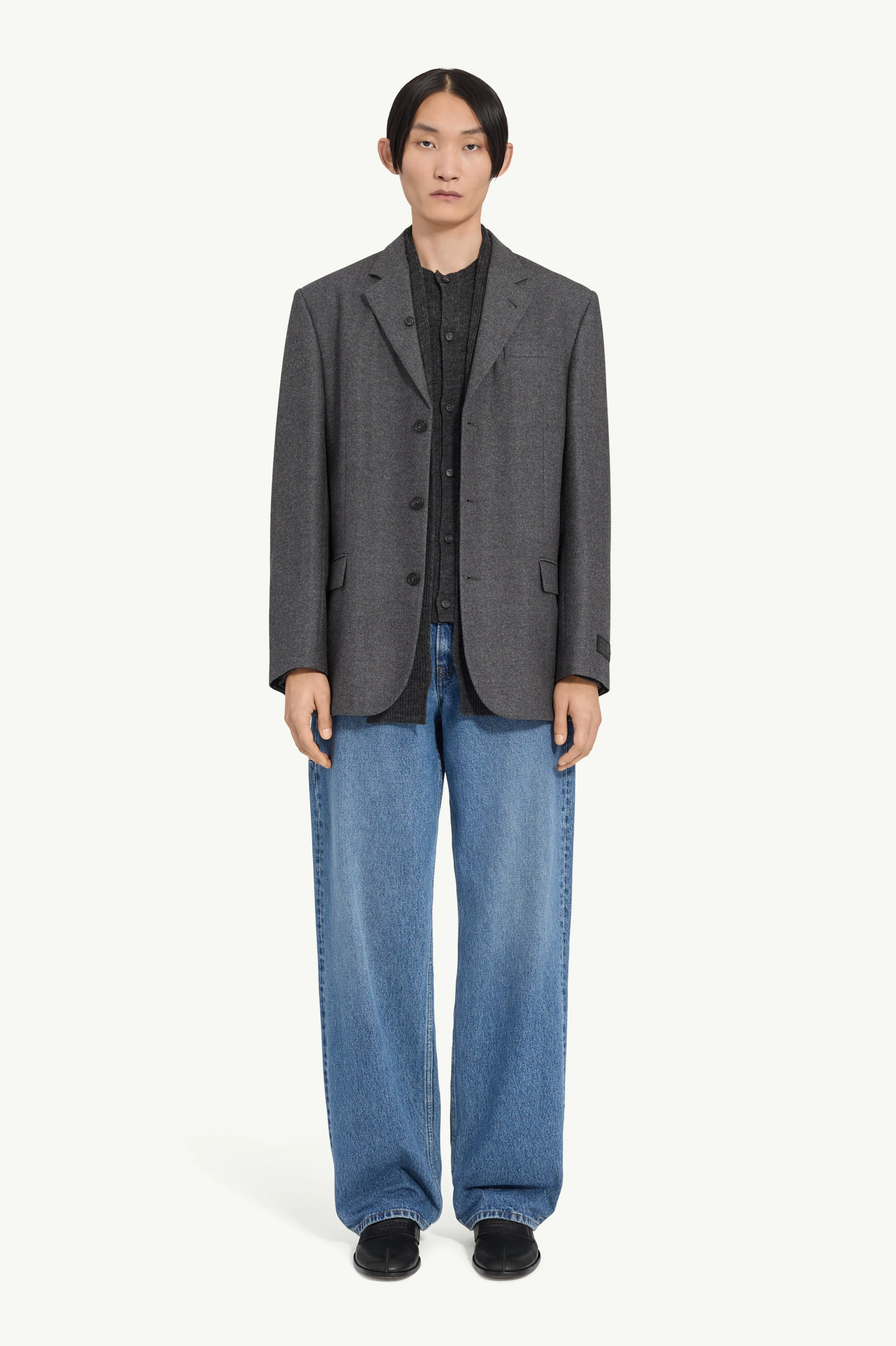 This grey jacket reframes traditional menswear codes through gentle distortion. Its sharp lines and pressed finish nod to tailoring convention, while the exaggerated length and dropped shoulders reorient the form. MM6’s signature white stitch line is embroidered across the upper back – a discreet but definitive mark of origin. Product Details Item ID SH0BN0016M35466860M Main fabric: 100% Virgin Wool Lining: 100% Viscose-Rayon Single-breasted blazer with notched lapel Four front buttons Long sleeves, buttoned cuffs Two front flap pockets Chest welt pocket Straight hemline, rounded corners Back center seam Visible interior lining at neckline Rectangular numeric label on sleeve White stitch line at the back Made in Italy Model is 190 cm tall and wears a size 48.