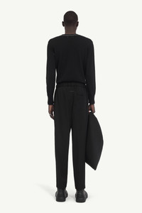 A contemporary take on formal tailoring, the tailoring wool trousers are crafted from virgin wool and cut to a straight leg. The style features drawstring closure and side pockets and is detailed by central pleats. MM6's discreet yet distinct signature, a horizontal line of white stitches, is also found on the back of the garment. Product Details Item ID SH0KA0023M35153900 Composition: 54% polyester, 44% virgin wool, 2% elastane Lining: 100% cotton Tailoring wool trousers Regular waist Straight leg Drawstring closure Central pleats Side pockets White stitch line at the back Made in Portugal Model is 6'2" tall and wears a size 48.