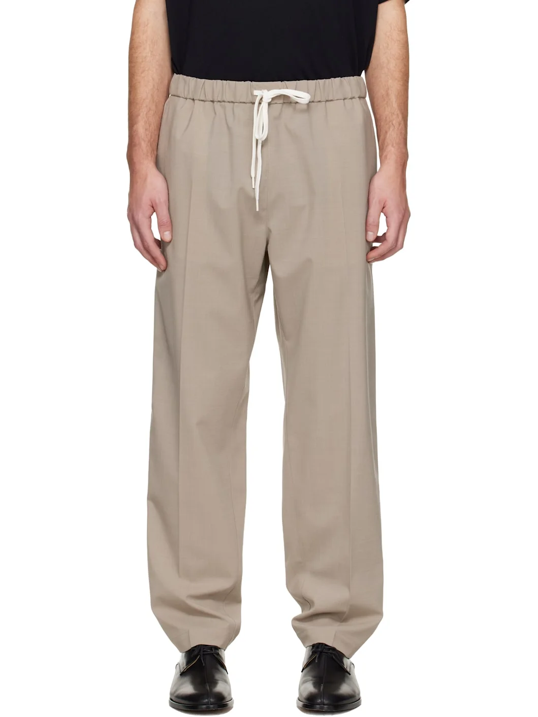 Plain-woven stretch wool-blend trousers. · Drawstring at elasticized waistband · Three-pocket styling · Creased legs · White stitching at back Supplier color: Dune Body: 54% polyester, 44% wool, 2% elastane. Trim: 100% cotton. Made in Italy 261188M191022