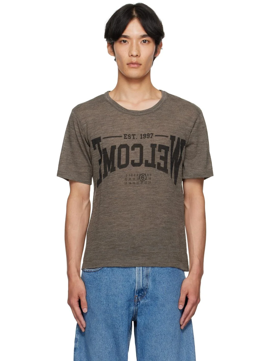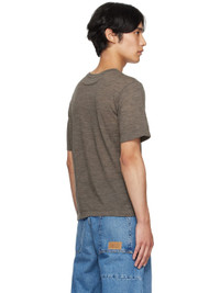 Semi-sheer wool jersey T-shirt. · Rib-knit crewneck · Text and logo printed at front · White stitching at back collar Supplier color: Taupe 100% wool. Made in Italy 252188M213013
