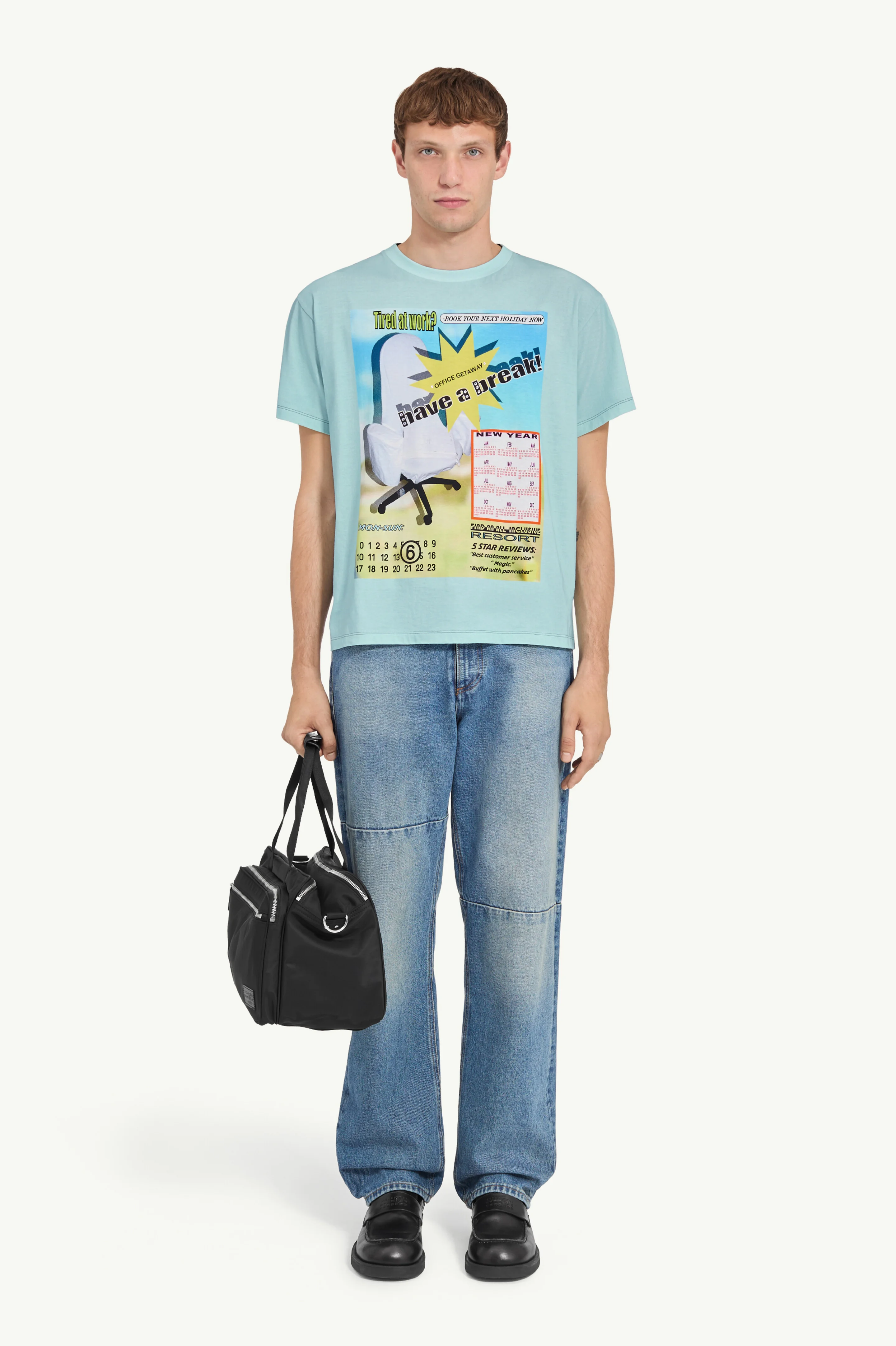 A cotton jersey T-shirt featuring reimagined advertisement-style graphics across the front and back. The layered prints recall vintage posters and newspapers, integrating imagery tied to the Maison with playful, found-object aesthetics. Finished with the MM6 white stitch line. Product Details Item ID SH0GC0065M20181001S Primary fabric: 100% cotton Graphic print on front and back Short sleeves Round neck White stitch line at the back Made in Italy