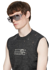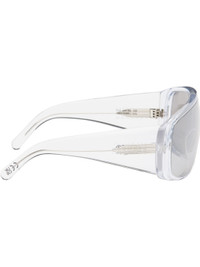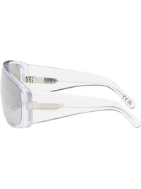 Handcrafted shield-style transparent acetate-frame sunglasses. · Mirrored gray lens · 100% UVA/UVB protection, category 3 · Integrated nose pads · Logo engraved at temples · Core wires · Includes pouch · Size: 135 Supplier color: White Acetate. Made in Italy 252188M134001