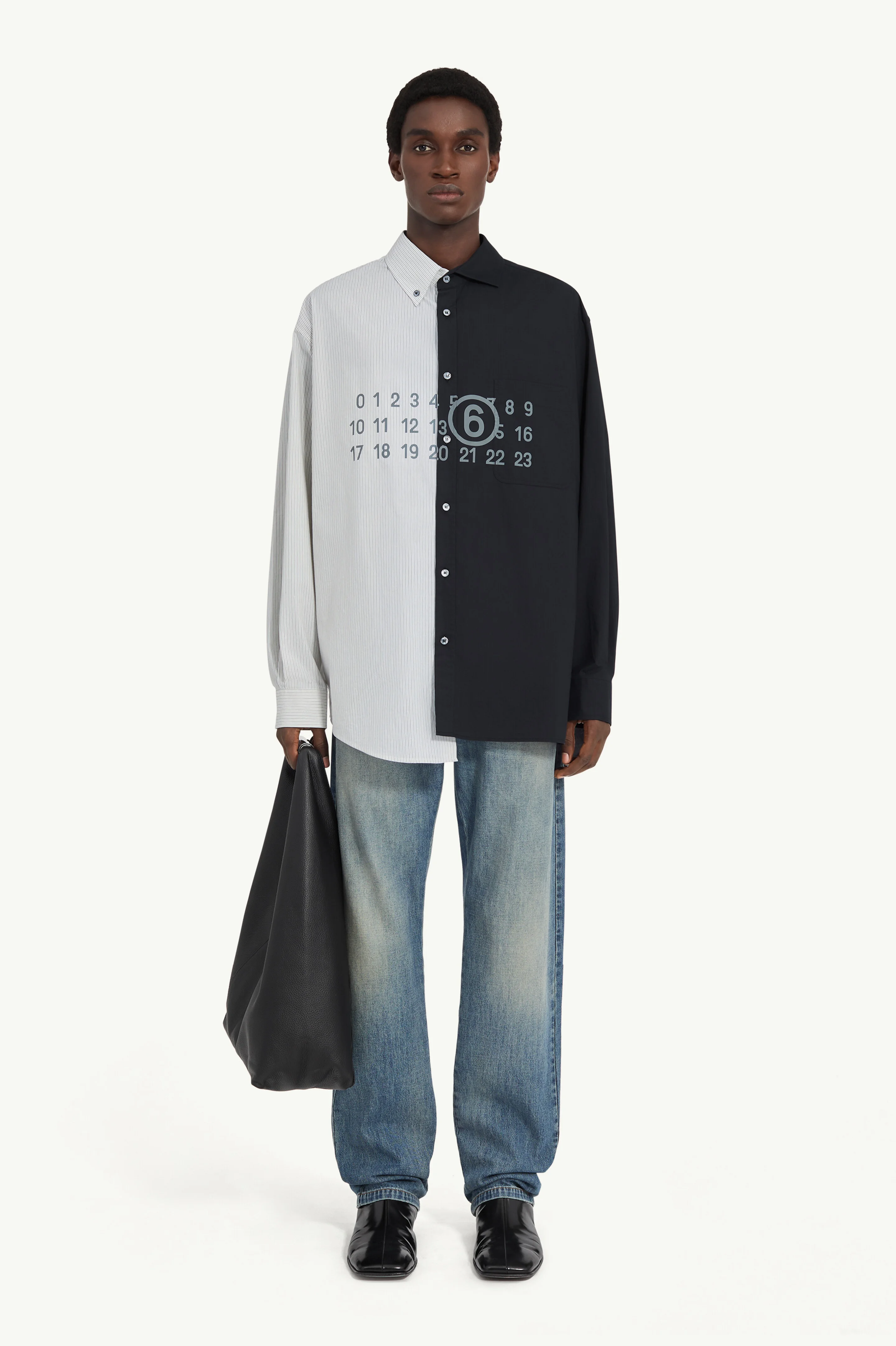 Cut in cotton poplin, the shirt embodies MM6’s subversive approach with half-and-half construction: one side striped, the other plain. Oversized numeric artwork stretches across both panels, deliberately offset by a chest pocket. Finished at the back with the MM6 white stitch line, the piece affirms its Maison identity. Product Details Item ID SH0DT0025MTN136961 Primary fabric: 100% cotton Secondary fabric: 100% cotton Poplin and stripy shirting Long sleeves Shirt collar Front button closure White stitch line at the back Made in Italy