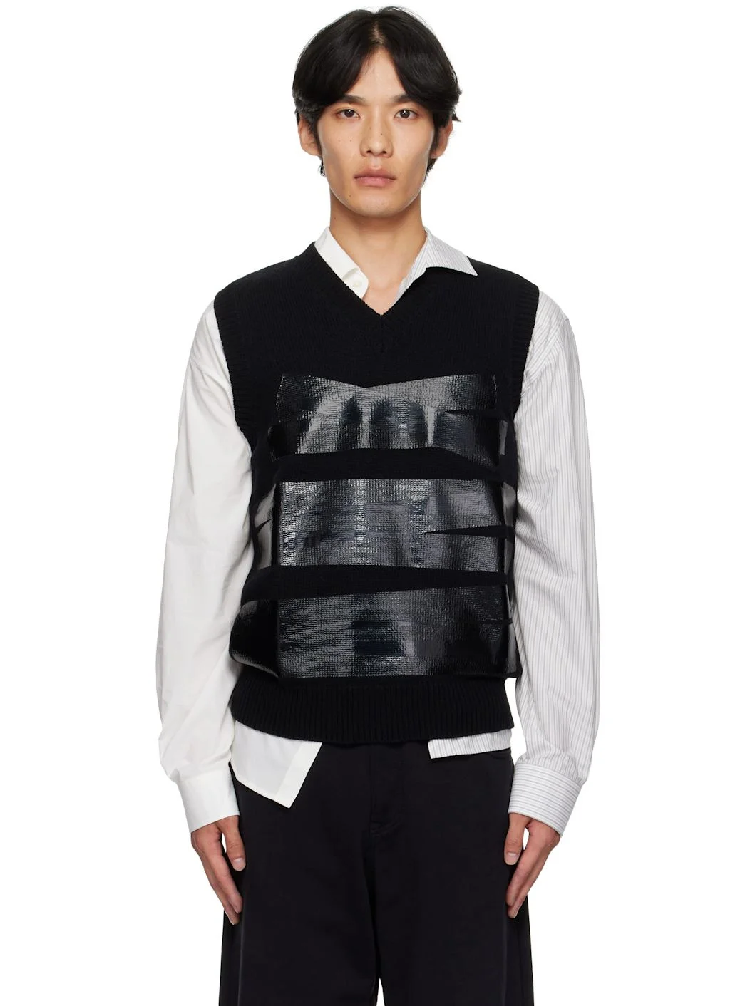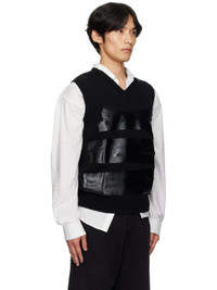 Knit wool-blend sweater. · Rib-knit V-neck, hem, and armscyes · Bonded detailing at front · White stitching at back collar Supplier color: Black 80% wool, 20% polyamide. Made in Italy 252188M206003