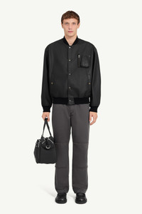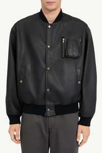 A varsity jacket cut in supple faux leather with a structured, boxy fit. The piece is detailed with a ribbed collar, cuffs, and hem, offset by a utilitarian chest pocket with zip closure and layered stitching. Snap buttons secure the front for a clean, minimal finish. At the back, the Maison’s signature white stitch line marks its discreet identity. Product Details Item ID SH0AM0080M35740900 Primary fabric: 100% polyester Coating: 100% polyurethane Lining: 100% viscose-rayon Zipped patch pocket on the chest Long sleeves Ribbed round neck Snap button front closure White stitch line at the back Made in Italy
