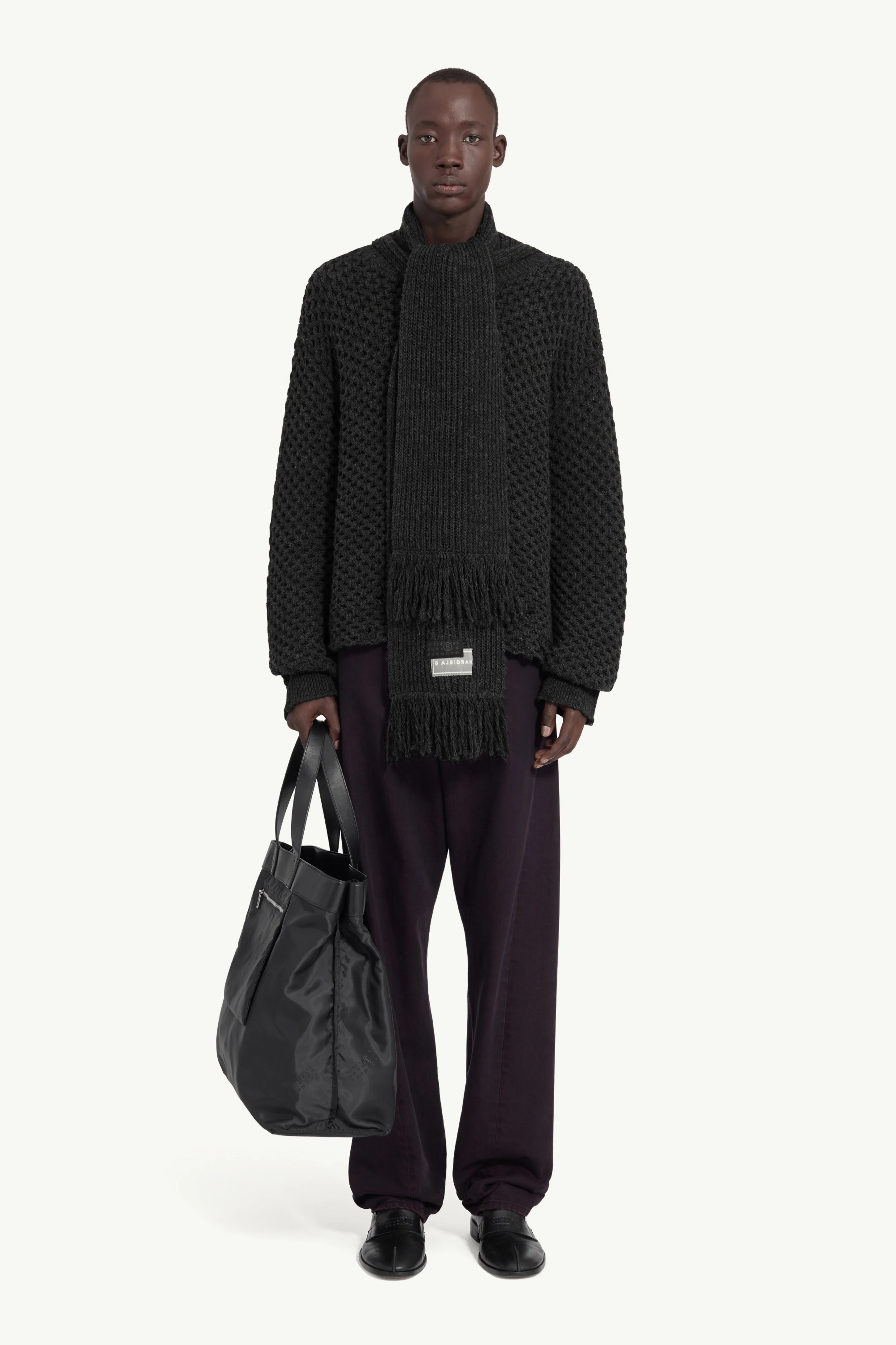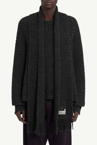 MM6 reframes knitwear through duality – a soft construction in waffle and rib with a built-in scarf. The generous silhouette and tactile surface create a sense of ease, while raw finishes, a single numeric label, and the MM6 white stitch line blur the boundary between garment and accessory. Product Details Item ID SH0HL0035M13132855M Primary fabric: 50% Virgin Wool, 50% Acrylic High-neck sweater with chunky knit pattern Boxy silhouette with high neckline Wide ribbed scarf attached Long, dropped shoulder sleeves Ribbed cuffs on sleeves Straight hemline design Chunky textured knit throughout Ribbed knit details on scarf and cuffs Fully knitted back with texture White stitch line at the back Made in Italy Model 1 is 188 cm tall, model 2 is 180 cm tall and wears a size M.