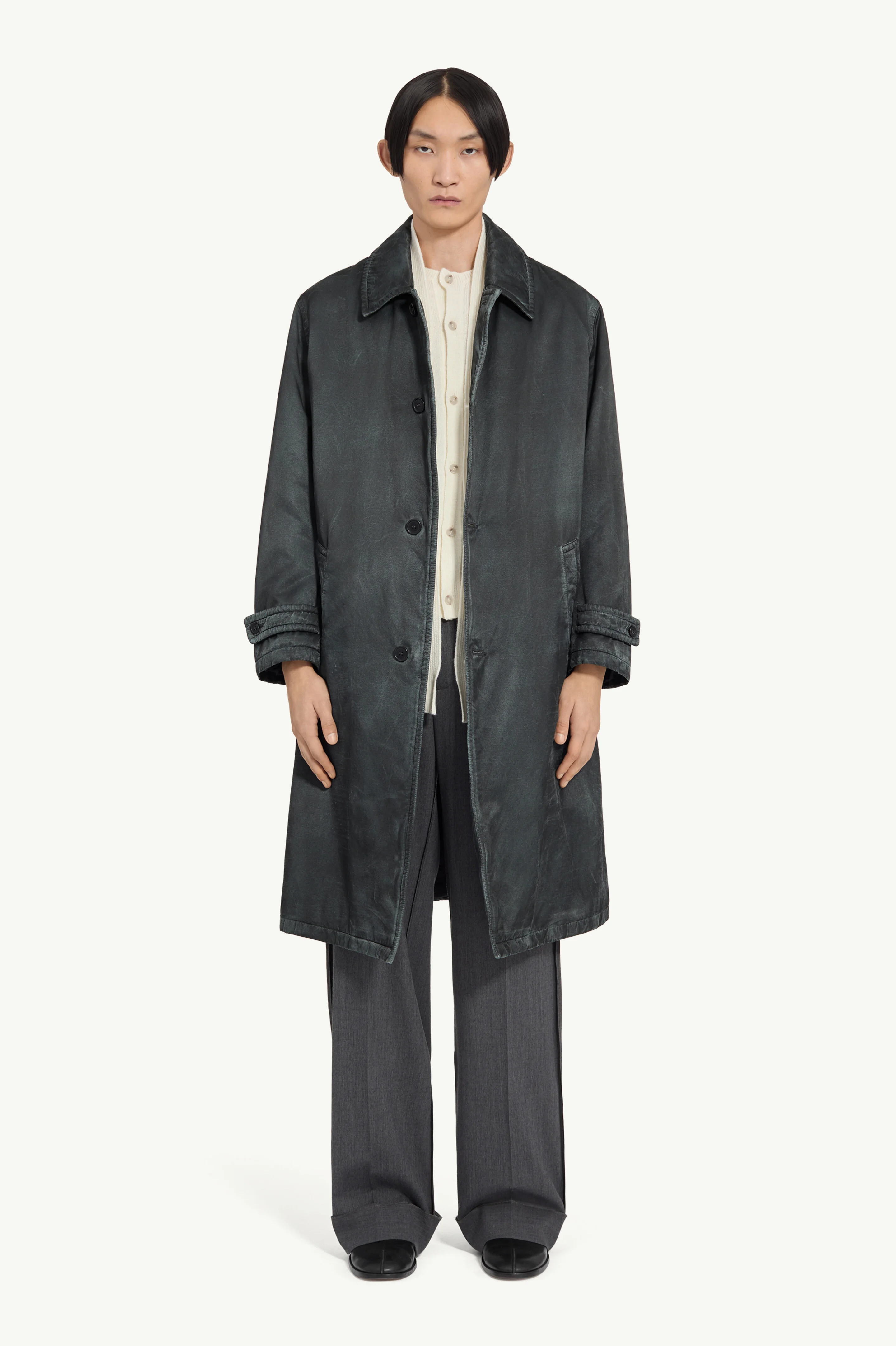 This longline coat in washed cotton balances utility and intention, softening classic structure with an uneven surface and tonal fading. Cuff adjusters and minimal buttons add to its pared-back, slightly industrial character. A single white stitch at the back identifies the garment as MM6. Product Details Item ID SH0AA0015M35452899 Primary Fabric: 57% Cotton 43% Viscose-Rayon Padding: 100% Polyester Lining: 100% Viscose-Rayon Pocket Lining: 100% Cotton Long coat with pointed collar Lightly padded with soft structure Buttoned tabs at the cuffs Welt pockets Visible seam through the rear White stitch line at the back Made in Italy Model is 190 cm tall and wears a size 48.