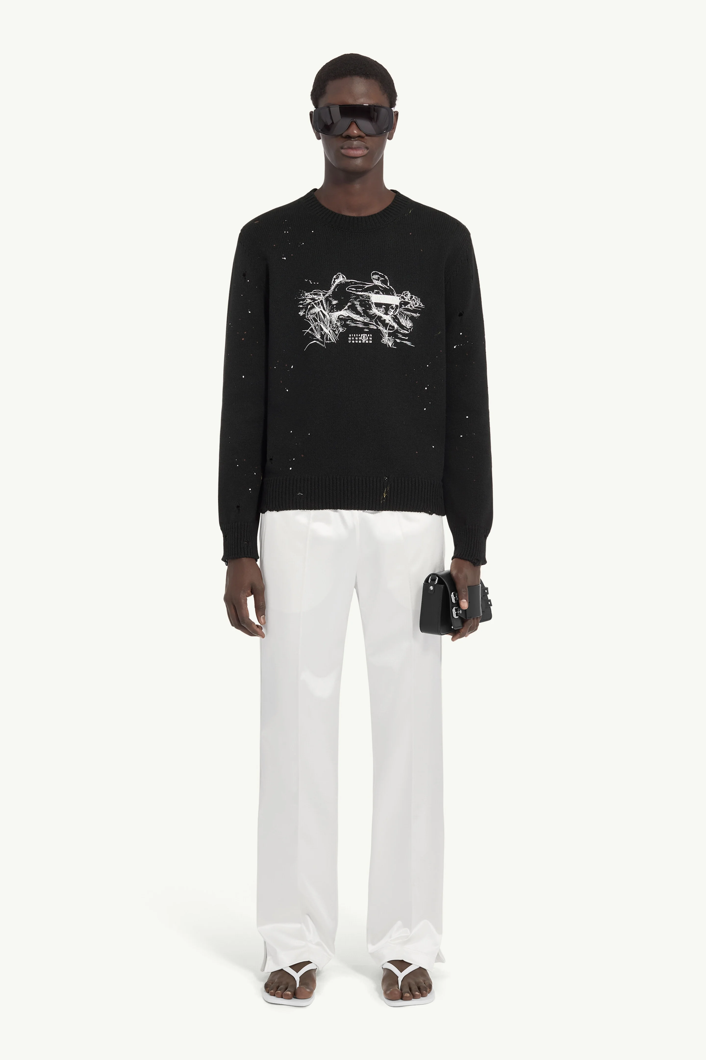 An invitation to explore the unexpected, this jumper features a white rabbit print alongside the instruction to follow your curiosity. Paint residue lends a tactile, unfinished quality evoking garments in flux, while the enigmatic call to adventure blurs the line between reality and the playful world of MM6. Product Details Item ID SH2HL0023M13123900S Primary Fabric: 75% Cotton 20% Polyester 5% Other Fibers Slitted camionneur Crewneck Front rabbit print Distressed details Ribbed trims White stitch line at the back Made in Italy